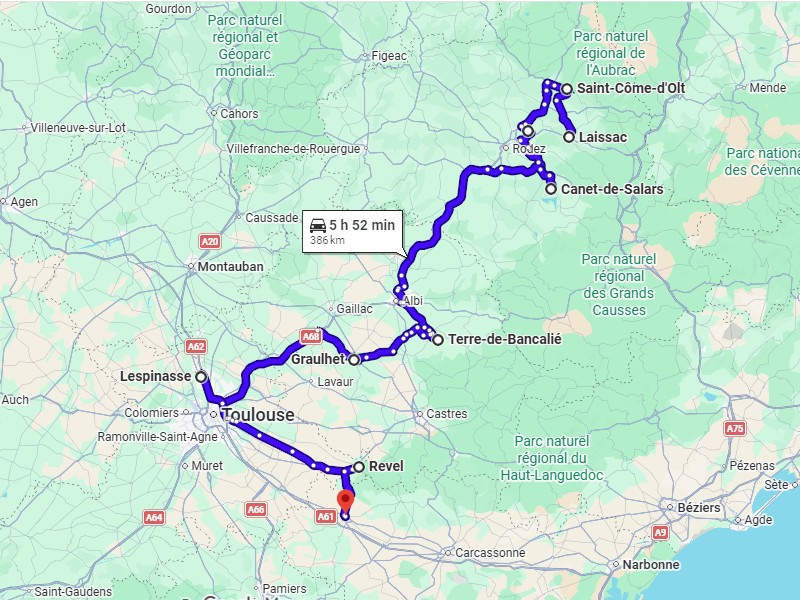 Je m'arrête au pain au dernier rond-point avant d'entrer dans Albi, mais c'est con, c'est une chaîne et il y a la même à la sortie de la ville direction Castres, bien plus facile pour se garer. Je ne m'en souvenais plus. J'attaque le pain au premier parking, vite fait j'ai du taf. J'ai une réno facile à Terre de Bancalié, c'est ces communes qui se regroupent et changent de nom, Gougoule était au courant de la manip'. Ensuite je vais à Graulhet, là c'est moins marrant, je m'enfile sur un chemin je pensais tourner au bout mais c'est bien trop petit, je recule, j'ai bien du mal, la semi tient absolument à descendre dans le fossé, je refuse, je finis par avoir le dernier mot. Vu la météo faut surtout pas s'aventurer hors goudron. La maison est à la limite du taudis, je me sauve vite. J'ai une bricole à poser à l'agence de Toulouse, je voudrais y être et repartir surtout avant la mauvaise heure. C'est juste une palette, un stand pour montrer du nouveau matos. Je ne sais pas si j'ai le droit d'en parler, donc... C'est Wat et pas Kun..e + Nag.l mais dans le doute.
