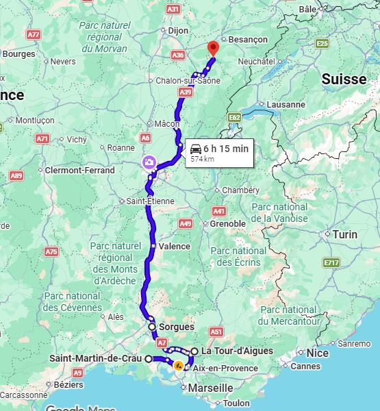 Je me fais un premier quart d'heure un peu avant Pont à Mousson. A Nancy le GPS veut me faire passer par l'autoroute ; Langres Dijon j'imagine. T'as entendu parler de la route des Vosgiens ? Après Pesmes j'ai 4 heures de volant bien tassées, je m'arrête manger vers les 4 fesses.