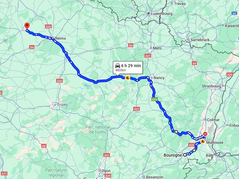 La traversée de Reims est bien pénible, on est à l'arrêt sur la route de Soissons après la zone commerciale.