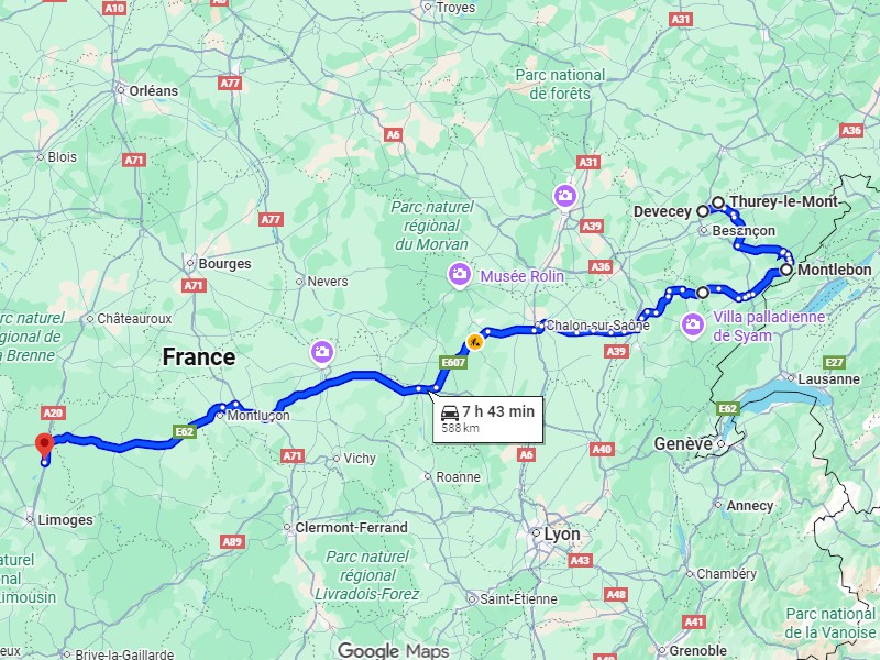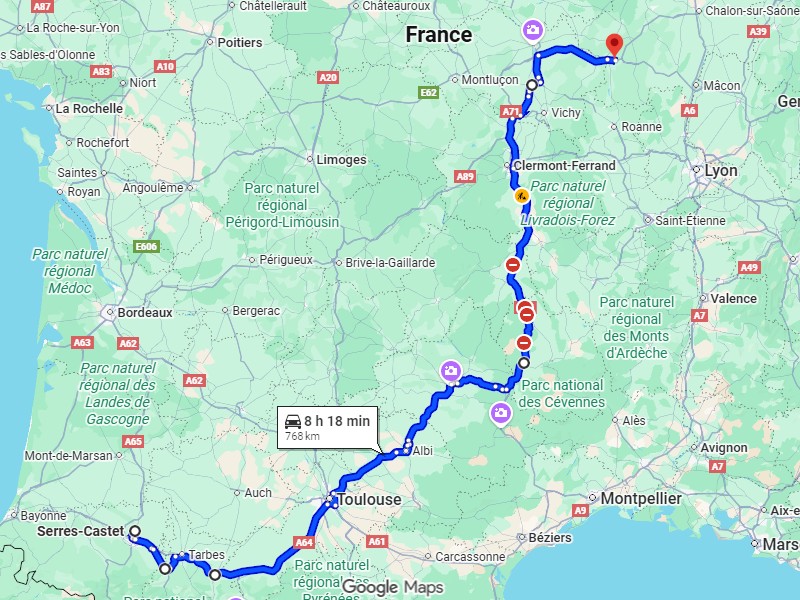 Comme d'hab le premier paquet de 4h30 m'amène à Moulins, jusque là ça va. La première perte de temps commence avant Limoges, il y a des travaux, on perd un bon quart d'heure. J'aurais peut-être dû passer par Bellac Confolens, j'ai voulu respecter l'interdiction, mauvaise idée. Entre Limoges et Angoulême la déviation de Roumazières Loubert est ouverte, ça doit être frais même Maps roule dans l'herbe. Ce bled était bien pénible, avec un radar de feu, danger ! Je ne rattrape pas le temps perdu à Limoges pour autant. Je finis ma deuxième coupure par là le long.