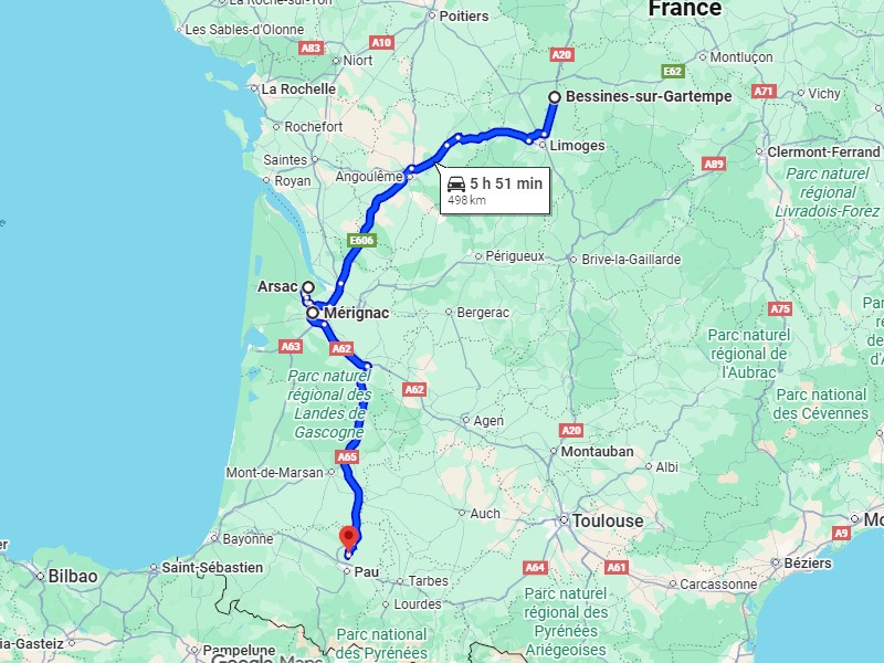Je garde l'autoroute jusqu'à Langon, c'est trop chiant sur la nationale. Ensuite j'enquille Langon Captieux Roquefort, ça file dans les bois, inutile de payer. Oui je sais c'est théoriquement interdit mais on va pas chipoter. Je reprends un petit bout d'autoroute d'Aire sur l'Adour jusqu'à Garlin, c'est à partir de là que ça se gâte. Il n'y a que quelques km mais c'est bien chiant, plus j'avance plus la route est étroite, je me retrouve devant un petit pont, c'est ultra fin. Je finis par y arriver quand même. Le village est minuscule, je me gare devant l'école, c'est à peine plus large. La maison est à 300m, je prends un petit chemin pour couper, merde, il y a une barrière. Demi-tour, je retourne sur la route et je fais le grand tour. Arrivé chez le client il me dit que la barrière n'est pas fixée, il suffit de l'enlever. Pour le deuxième tour ça va bien plus vite évidemment.