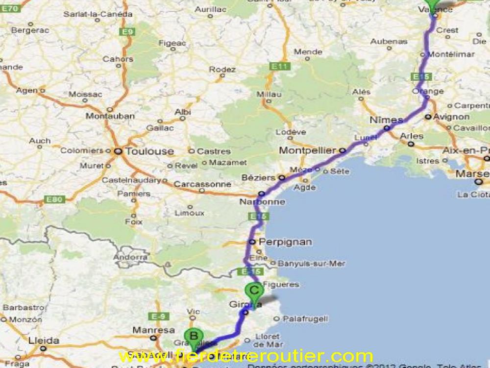 magnifique A7 à 90km/h, enfin 89km/h. C'est long. En plus j'ai tellement bouffé ce week-end que j'ai pas la gniare. La pause café est loin, enfin, elle est fabrègues. Ambiance sinistre dans la station, tout juste animée par des ptits bouts de choux qui tapent des sprint en couche culotte au milieu des rayons de la station. C'est les vacances, et ça se voit, il y a pas beaucoup de camioneros, ni ici, ni sur la route. Dernière partie de coupure au village Catalan juste avant la frontière, le gars habituel n'est pas là, j'ai donc personne avec qui papotter. Car j'aime bien pappoter. Tant pis, je fais le minimum de coupure réglementaire et vu le poids extrème dans la semi je monte El Pertus à la régule ou presque. Je sors de l'autopista à Figueras, il y a personne sur la NII non plus si bien que je perds quasi pas de temps, et puis ici, il y a encore pas pour l'instant de radar discriminant.