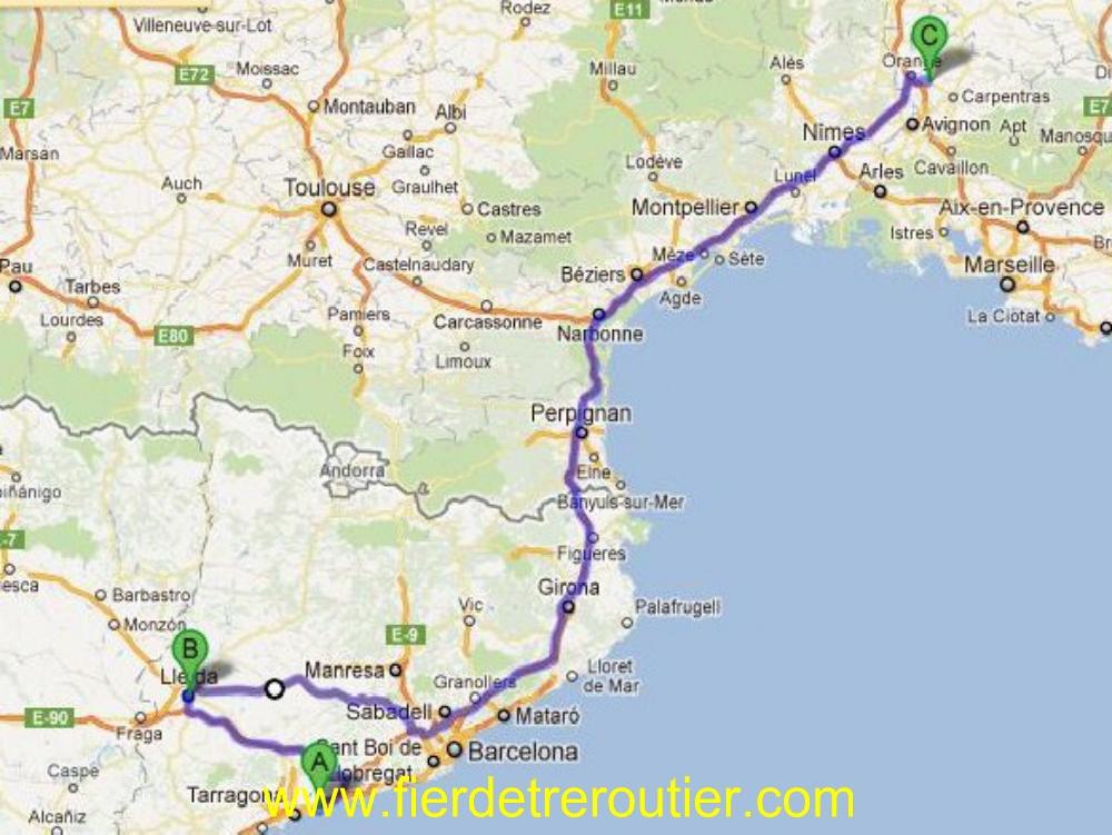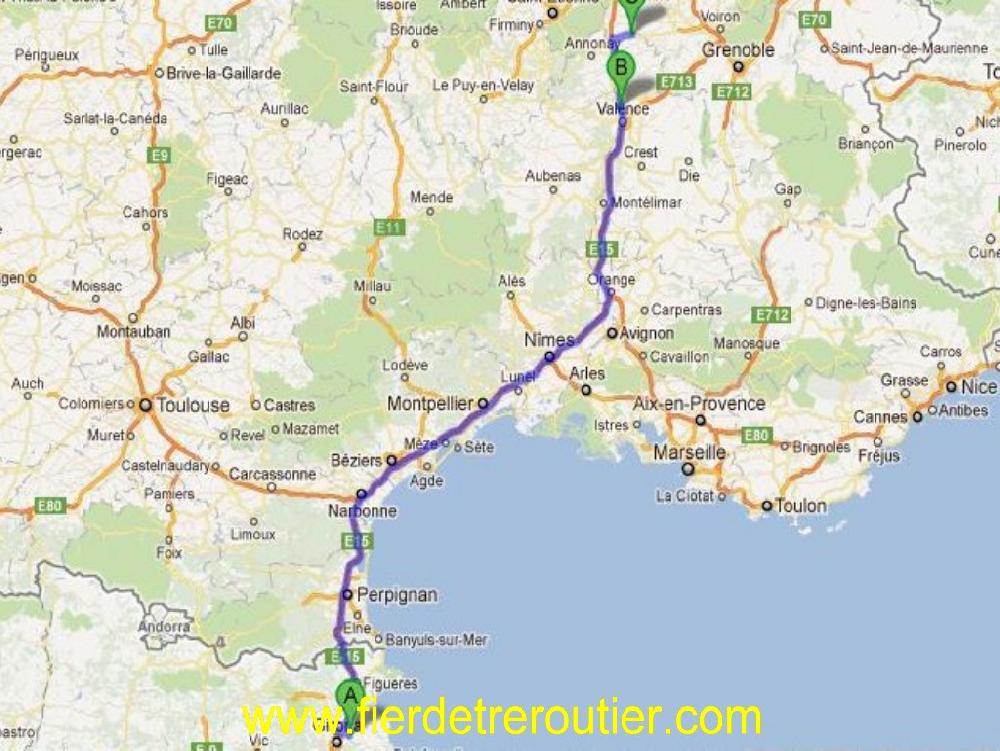 Quand je repars, je met le 19 à fond et j'essaie de dechiffer les hurlements des routiers espagnols moyens. Visiblement c'est bien le binz sur la montée, par précaution je garde donc la natio et effectivement ça bouchonne dès la sortie du grand péage, arrivé au dernier rond point je vois que ça bouge toujours pas. D'un coup ça m'a pété, j'ai pas eu envie de passer 2h pour passer le bouchon et je brave l'interdiction par la natio via le Perthus. J'ai croisé les mossos et j'ai tourné la tête. Pas un camion pour m'accompagner, juste une dizaine de caisseux collés au portes du frigo. J'ai traversé le Perthus tout doucement, et le noyau d'olive que je m'étais calé entre les fesses a fini par donner 10L d'huile arrivé au Boulou ou j'ai poussé un OUF de soulagement une fois de retour sur l'A9. Je sais, c'est mal, mais j'ai gagné 2h minimum. 20km plus loin, il y avait encore un bouchon, je suis sorti juste avant à Perpi sud, ras le bol de ces travaux, c'est abusé. Je pense que certains aujourd'hui ont dû pulveriser des records de lenteur. Tout le reste de la montée sera bien stressant, tout le monde est plus qu'en retard, personne ne lache rien, tout le monde laisse glisser dans les descentes, c'est chaud patate ce soir. Pour ma part, j'arriverai pas à rejoindre Vaison ce soir, c'est pas la peine. Les compteurs sont tous à l'orange vif quand justement je sors à Orange, j'ai bien vu Mich07 au routier le long de la N7, mais c'était plein, je me pose pile avec 9h59 à l'entrée de Jonquière sur un bout de terre dans la zi, quelle journée !