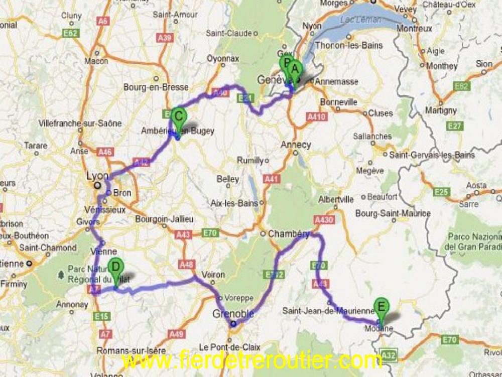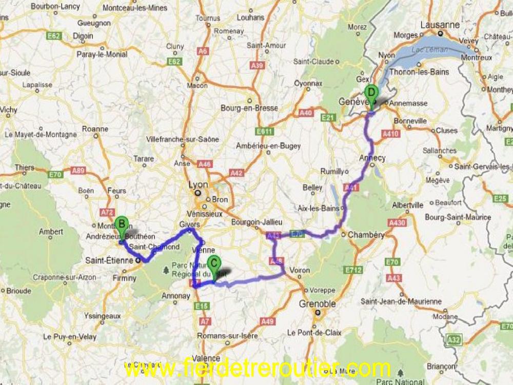 Il reste en tout et pour tout 120cm de plancher, mais le chef me fait rentrer quand même à la base. Bien que je sois chargé dans l'ordre, je sens que je vais pas garder le voyage, je sais pas pourquoi, une intuition. Chose extraordinaire, il pleut sur St Etienne et c'est franc le boxon, mais heureusement il y a un grand soleil sur St Chamond, la pluie je la retrouverai que bien plus loin du côté de Rive de Gier. Quai n°2 qu'il a dit le chef, aussitôt à quai je vide les clients et surprise du chef toujours, je décroche pour aller récuperer une taut chargée en arbres pour une destination exotique en Suisse , à environ 10km de Bardonnex. Je vérifie si j'ai mon passeport, tout est OK, la plaque TIR est en place, y a plus qu'à ! Armé de la magnifique ex semi à Lionel le rugbyman je coupe à travers champs pour rejoindre la Tour du Pin. Tout autour les sommets sont blancs comme en plein hiver, j'y comprends plus rien. Pas grand monde pour rouler ce soir, tant mieux c'est cool. Je suis passé pour la première fois sur la nouvelle autoroute qui relie Annecy à la Suisse, il y a un tunnel vraiment balaise, et on gagne un temps fou, c'est bien sûr moins buccolique que l'ancienne nationale, mais il faut vivre avec son temps. J'échoue à presque 23h sur le parking de douane à Bardonnex, il reste de la place, tant mieux !
