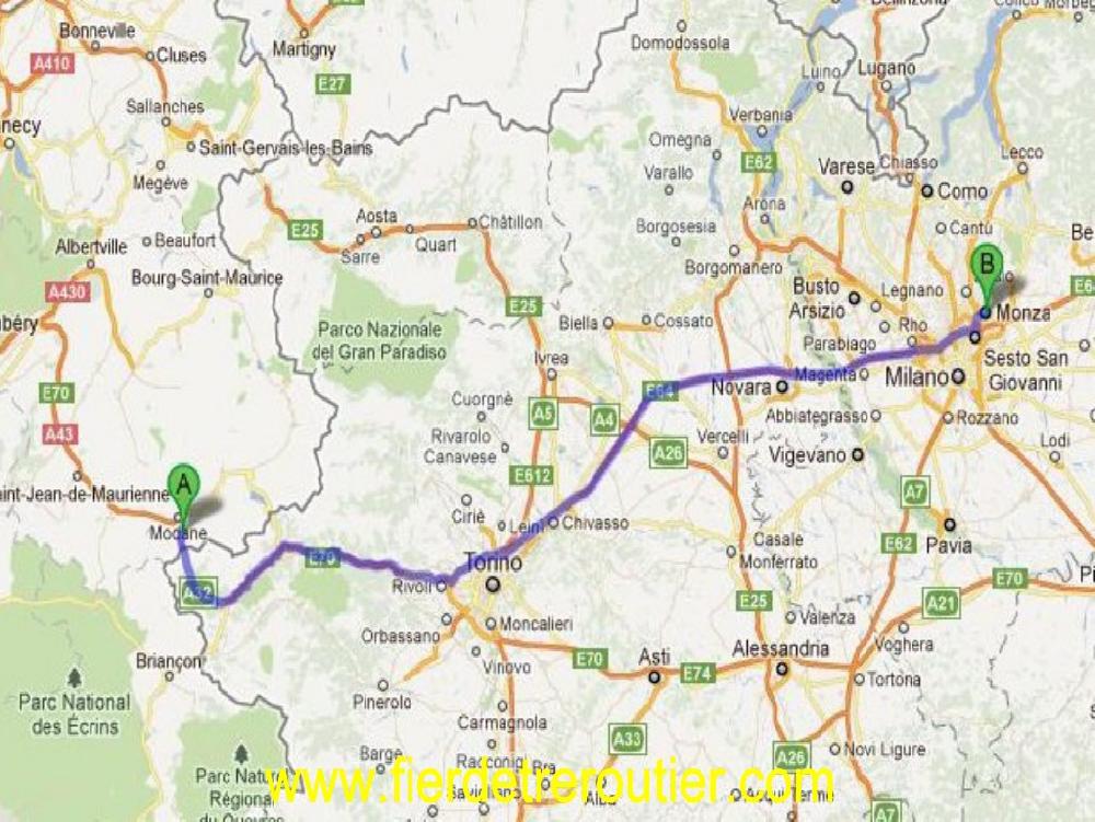 J'aime bien rouler le samedi, il y a personne, c'est vraiment relax par rapport à la semaine ici, même pas levé le pied dans l'ultime tranche de travaux sur l'A4 entre Novarra et Greggio. Je passe Torino aussi finger in the nose, et je me paye une pose panini à Oulx, il y a des keufs de partout, j'ai vu que dans la montée les écolos anti TGV ont même monté des cabanes dans les arbres pour retarder les travaux, determinés les écolos ici, ça fait plaisir de voir des gens resister, s'opposer, putain ça donne la banane ! Je verai bien des groupes de transporteurs lutter aussi, dans des cabanes de fortune en haut des arbres ou des PMV sur le bord des autoroutes pour revendiquer, mais non, je rêve. La pluie va cesser une fois sous le tunnel du Fréjus, ce qui permet aux balais d'essuie glace de se reposer un peu.