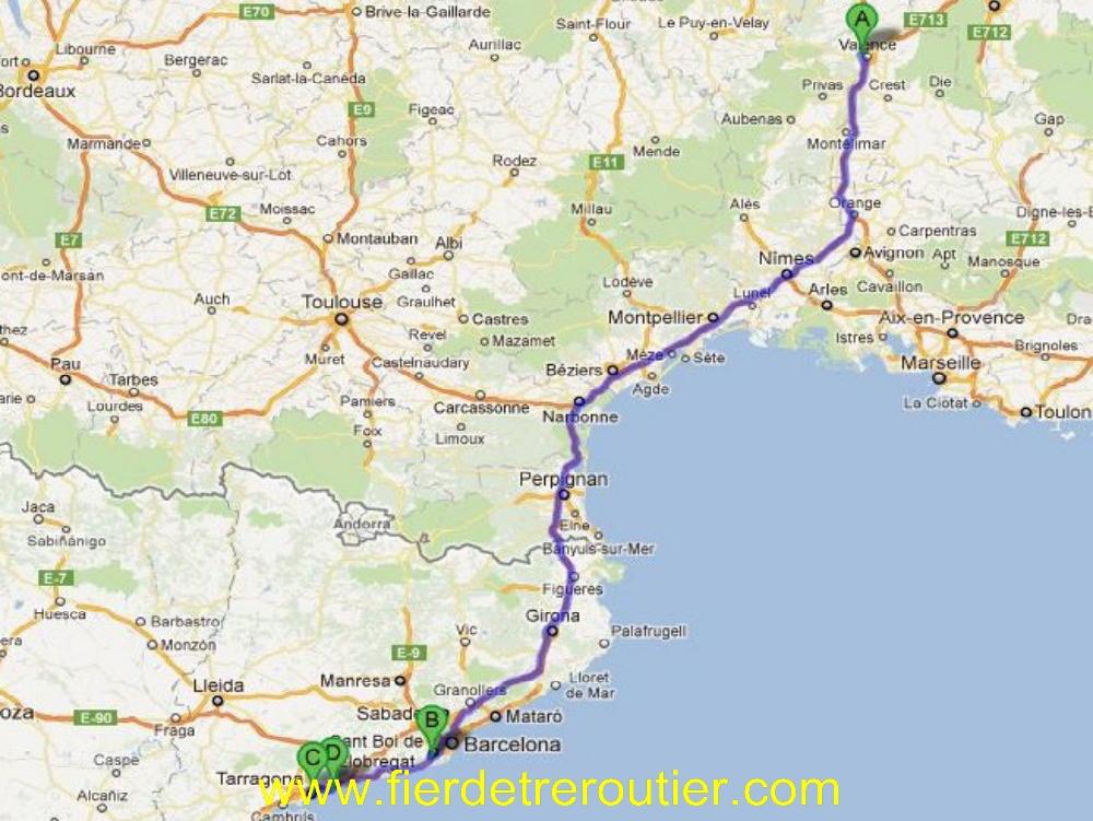 Ma seconde étape me mène tout droit en direction de Barcelone, après Narbonne, le vent redouble de vigueur, et mélangé à la pluie la route est bien pénible jusqu'à Perpignan, je stoppe couper 45 à Figueras parce que j'ai la dalle et que je suis pas à la bourre. Le soleil fait enfin son apparition sur Barcelone, ça fait bizarre, ça pique les yeux. Je tombe ma palette que j'avais tiré au cul en 2 secondes à Viladecans, avec l'accord du chauffeur déjà en place pour charger, il vaut mieux demander avant, il y a des tétus des fois. J'ai peur de pas pouvoir vider mon dernier client à Tarragone, mais grâce aux infos d'Aurelien, je pense que j'ai quand même une chance je la tente donc. Comme il fait beau ici, il y a des radars posés à presque chaque embranchement dans des voitures banalisées, on se croirait en France. Les mossos receptionnent les bandits au péage, c'est bien foutu. Je finis par me pointer à 16h45 chez le client, depuis le temps que je suis pas venu tout a changé, casco obligatoire, manche longues, badge et tout le bazar. J'adore tirer au transpal à main des IBC de 1000kg en manche longues et casque, il y a comme un problème dans l'énoncé. Je râle pas, j'arrive déjà in-extremis.