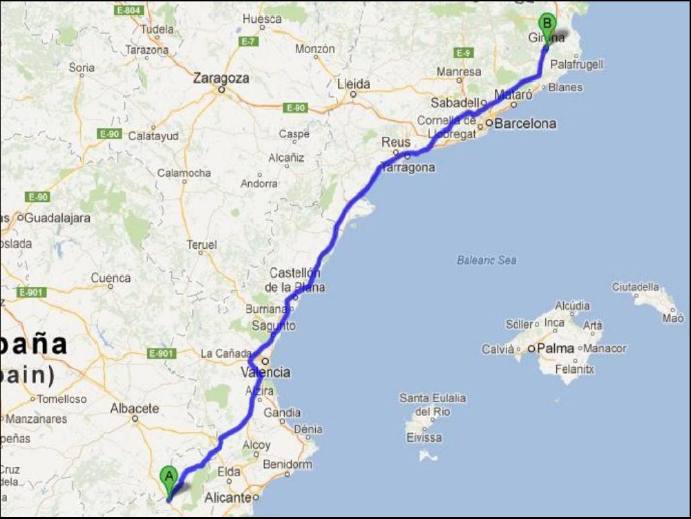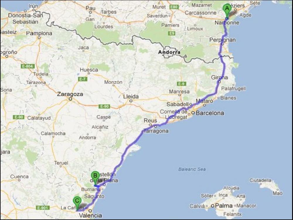 J'ai vraiment mal calculé mon coup en me posant hier soir, car je suis reveillé par une chaleur d'enfer, le soleil tape pile face à moi. Je mate l'heure : 8h15. Je fous un coup de clim, et je me rendors jusqu'à 10h. Je traverse le parking poussiereux et jonché de detritus internationaux pour prendre un copieux petit dej. Dans la salle, il y a un couple avec 3 petits, il y en a un des 3 qui braille tellement qu'on entend même plus la télé, mais les parents restent impassibles, je regardais de loin le père, il avait franchement l'air absent. Je vais vite me renfermer dans mon cockpit au calme. Dès que la coupure affiche 9h, je décolle toujours sur la même route, il y a pas grand monde. Ce n'est qu'à partir de Yecla que je trouve un peu de trafic, en tous cas le coin est typique espagnol, la modernité n'est pas passé par ici. Il y a plein de bon coins pour faire de belles photos, posé à côté d'une ruine, sous une sation destroy et abandonnée, avec des palmiers, mais j'ai la flemme, je profite de paysage pour moi tout seul, car je suis un egoïste. Ce n'est qu'au bout du bout de la natio que je trouve un trafic trés dense et dangereux entre Caudete et La Font de la Figuera, mais bientôt un bout 4 voies va venir à bout de cette difficulté. Ensuite c'est tout shuss jusqu'à Valencia, RAS, sinon qu'il fait quasi moche. Chaud et moche. Je charge dans une énorme usine de carrelage à Almazora juste à côté de Castellon. L'usine on la voit sans problème 1km avant, mais le truc enervant c'est de pas piger tout de suite comment y acceder ! Je finis pas y arriver au bout d'un moment, le parking est blindé de camions en attente, c'est la pause gastro jusqu'à 15h30, j'ai donc une grosse heure à tuer.