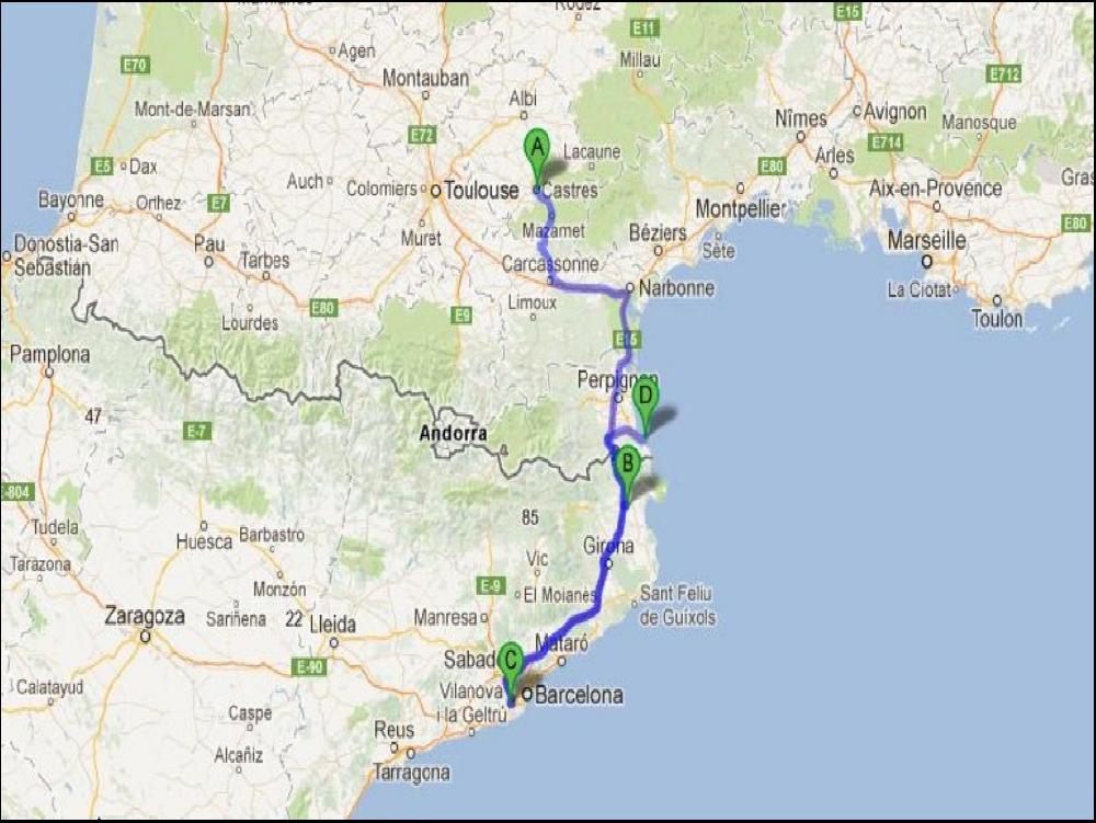 Il pleut encore ce matin, de toutes façons, à chaque fois que je viens à Castres, il pleut. Ici, pas de machine à café, strict minimum, un gardien débordé, des fenwick, un quai basta. C'est la panique ce matin comme d'hab ici. Le plus long c'est de s'enregistrer et attendre que le proposé à la température retrouve son theromètre et se radine au cul du frigo. Et ce matin, ça se passe comme prévu, j'ai juste à attendre que la coupure marque 9h01 pour vite rentrer et même mettre à quai, après, c'est un boulevard, 5 minutes pour sortir les 4 palettes. Mon second client se trouve à 140km à vol d'oiseau de Castres, mais à plus de 3h de route, à Vilamalla charmante petite bourgade du sud Figuerassien, vu qu'ils arr^tent à 13h15, c'est donc cuit, j'ai donc sagement pris mon temps de m'arrêter 20 minutes aux Corbières afin de me decrasser.
