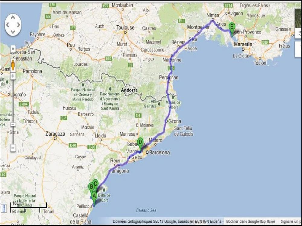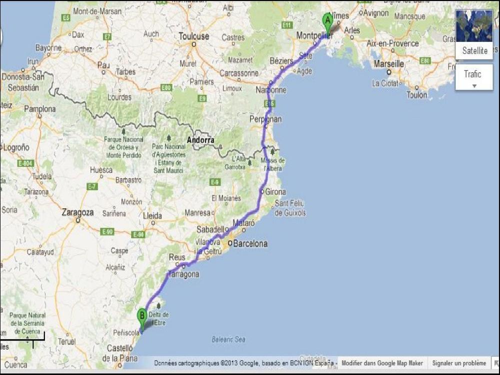 A midi j'ai terminé et je file à La Jonquera faire quelques emplettes. J'aime pas trop, mais j'avais pas le choix. Je traine pas et je vais vite me poser chez Padrosa car j'ai les crocs et on mange bien chez Padrosa, surtout le truc, c'est de manger ZEN, en plus avec le ticket du repas le parking est gratos, pourquoi se priver !? Ensuite je garde un peu la natio pour m'approcher de Barcelone. Encore une petite pause en passant à Altafulla histoire de faire un pe le point avec les heures. En repartant il se met à pluvasser, et la flotte ne me lachera pas tout le long du trajet jusqu'à Peniscola. C'est rare que je trouve de la pluie dans le quartier quand même... Pourquoi es ce qu'il pleut ? Peu être parce que les français vont mettre une patée aux Espagnols au foot ce soir ? Va savoir ! Je me gare donc le long de la 340 et le long aussi de chez mon client, 20h45 fin de cette éprouvante journée de feignant.