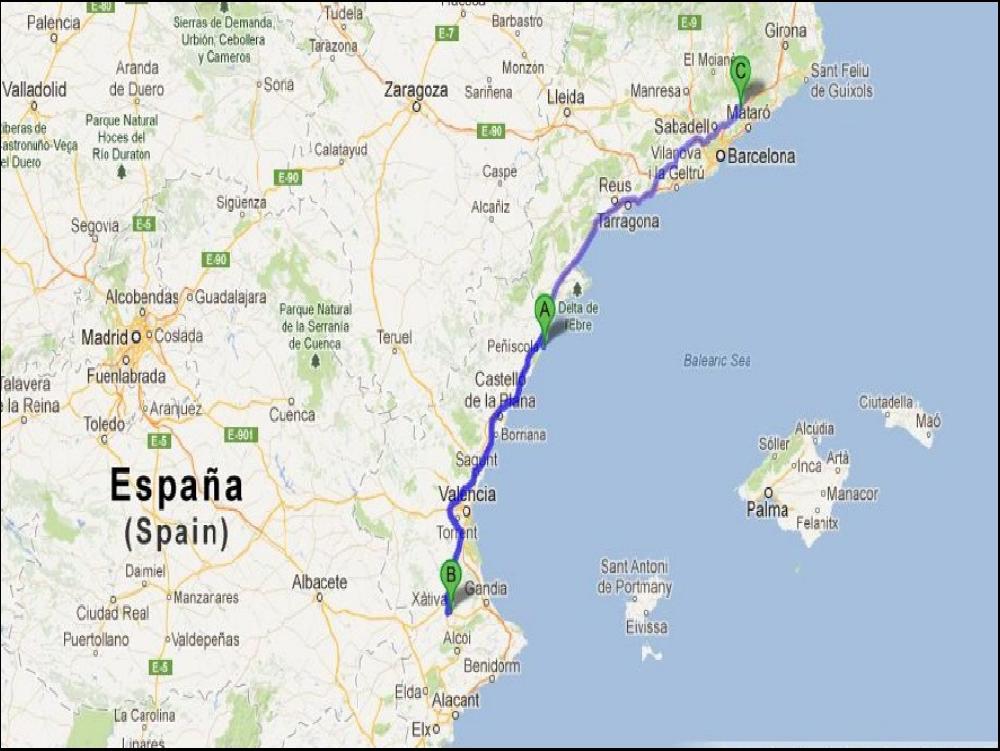 Les formalités sont bien lentes pour rentrer, il y a un petit nouveau en formation, la sorcière habituelle est sur les nerfs tellement que le nouveau pige rien. Par contre pour vider ça va extrement vite. J'en profite pour calculer la suite ; le GPS m'annonce 1h55 pour rejoindre Peniscolà, il me reste 1h59 de route. Pour 4 minutes de marge, ça serait con de pas tenter le coup, alors je tente. Bien concentré, je fais une carresse à mon fidèle compagnon de route et je lui carresse la pdale de droite sans jamais la lacher tout du long. J'y croyais pas trop en partant, mais y a rien qui m'enerve plus que de pas tenter. J'ai foutu un album de "She wants revange" dans le poste, et là, y a plus rien, mis à part les Mossos qui peuvent m'arreter. J'avais tellement la pêche que j'aurai pû tracer jusqu'à Agadir, mais non, j'ai été sage, je suis sorti comme un bon soldat à Peniscolà. Une fois delesté de mes 14 palettes, je me sors du quai avec la banane ; 9h58 de guidon ! Y a bon !!! Le seul truc pourri dans l'histoire c'est que je suis dans le seul endroit de l'espagne ou il y a pas de rade et planté là le long de la n340.