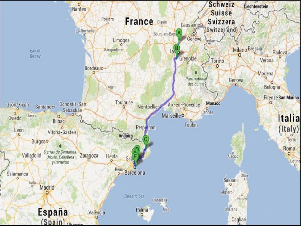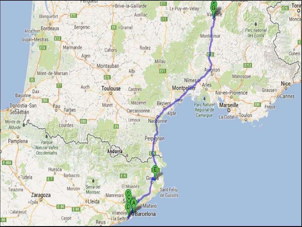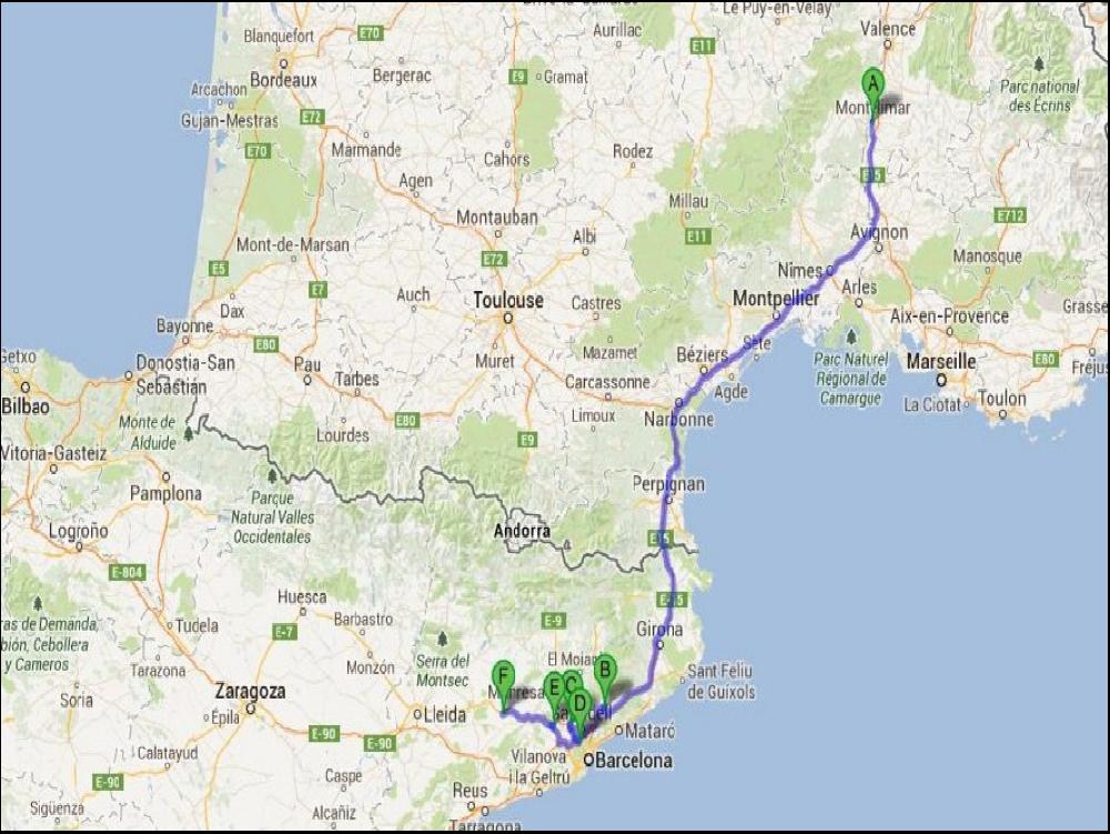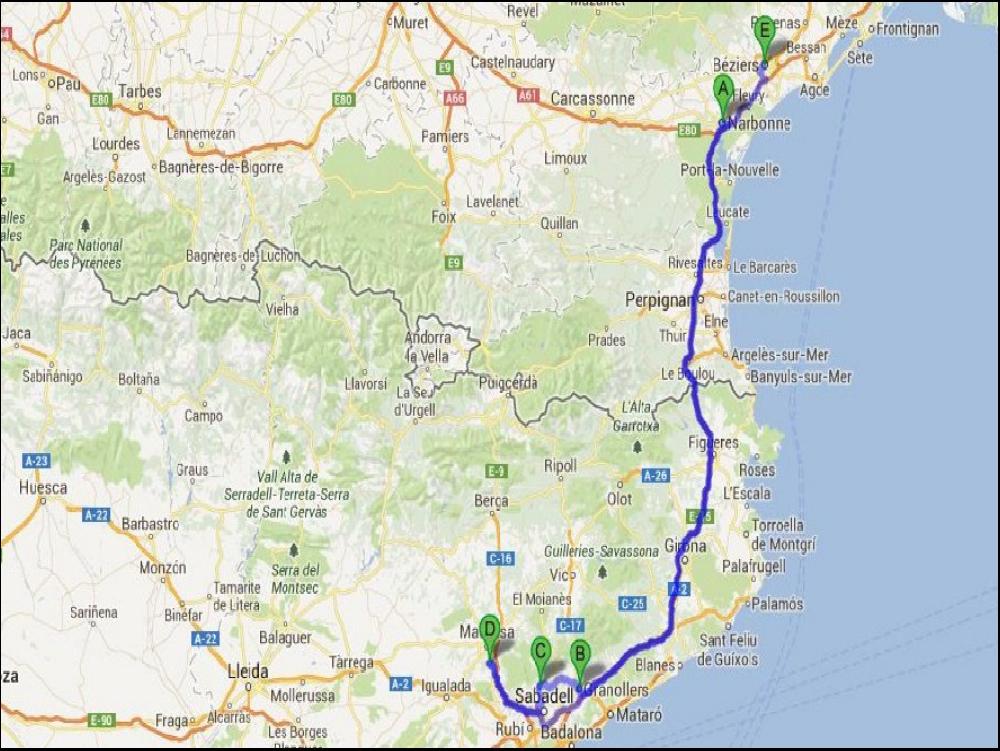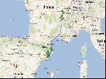 Quand je me lève, c'est le kif total ; le rêve du routier nuiteux moyen ! Le coin café reste ouvert toute la nuit, et la douche aussi !!! Chaude, propre avec de la pression ! Elle est pas belle la vie ??? A minuit et des boulettes, je demarre après avoir partagé une sèche avec le gardien. J'enquille l'A2 direction Barcelone, et j'entame un grand dileme avec le GPS, le 500 et ma gueule. Le GPS voudrait que l'on continue par l'A2, et Barcelone. Le 500 est vaillant cette nuit, et il est comme moi en fait, il fretille à l'idée de prendre la C25 via Manresa. Bon, alors vu qu'on fait comme on veut, on enquille par le C25, une belle 4 voies desertique cette nuit, tout en courbes, contre courbes et côtes bien sûr. Il rest juste une petite portion de 5km en travaux, ou bien sûr je rattrape un grumeau avec une betaillière chargée de cochons et un AE Euro 0 devant. Sinon, après, Mach2 jusqu'à Girona, personne, personne ! Le PIED !!!!!!!! Tant et si bien que l'alarme des 4h30 clignote à une dizaine de KM de La Palme, et je commence à avoir grave envie d'un café.