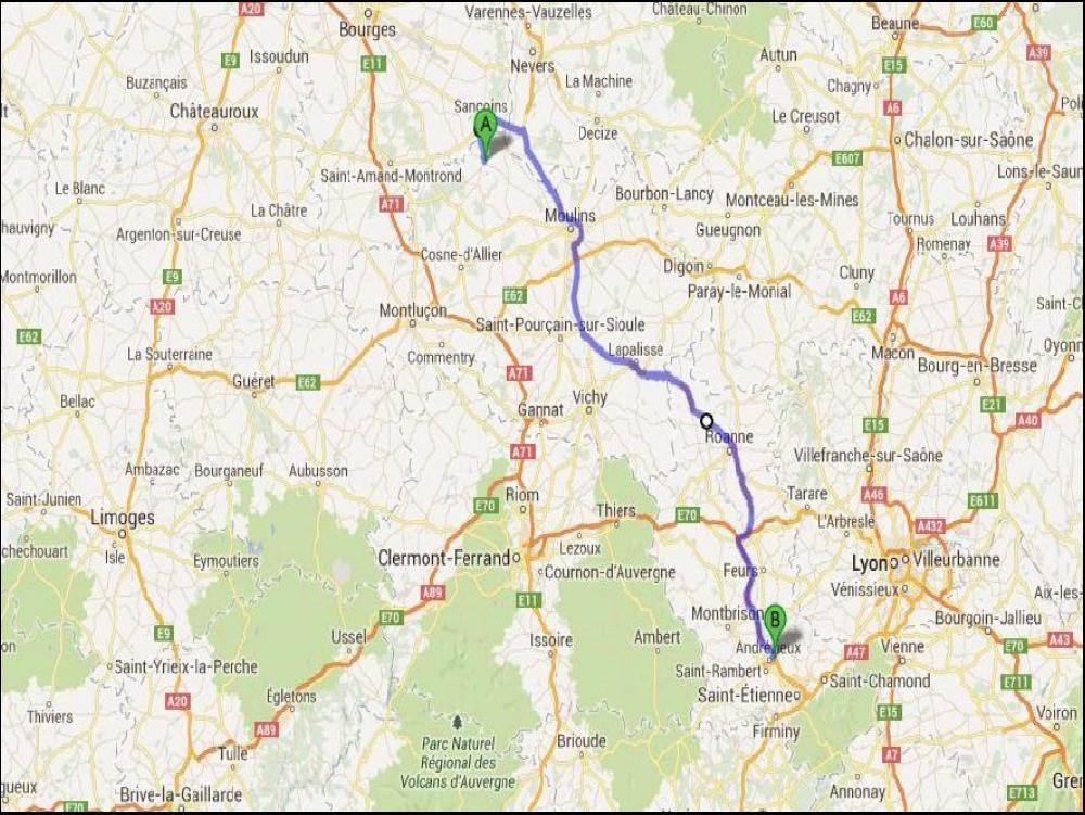 Finalement, vers 15h30, on me demande de placer mes 3 palettes dans un box. Enfin, un peu d'exercice. Vu qu'il fait affreusement moite et lourd je prends une bonne suée. Sur le téléphone me parvient une bonne nouvelle, je recharge demain à 8h à Andrezieux, ce qui me laisse le temps de prendre une bonne douche avant de decoller. Vu que je suis pas pressé, j'y vais tranquillement, et heureusement que j'étais pas pressé, car je vais devoir me coltinuer tout ce que la planète comporte comme grumeaux, tracto pelles, tracteurs, auto écoles, Premium 370 chargé à 44t, bref, de quoi devenir dingue. Au bout de 3h05 d'efforts surhumains, je me pose sur le parking à Andrezieux, 20h fini journée ! Ah ça a du bon le mi-temps !