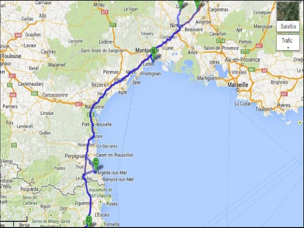 Pour repartir, il faut traverser l'integralité de Carnon, et tout a été fait pour que ce soit emmerdant en semi. C'est rigolo, mais y a de quoi stresser, en passant devant la capitainerie je faisais pas le fier, et rarement dans ma vie, il y a eu autant de nanas en maillot qui m'ont regardé. Une fois sur la 4 voies de Montpellier je respire et je me concentre sur la livraison suivante. Une petite QSO avec mon copain Larage et je loupe Nico54 de peu, le hasard faisant souvent bien les choses, en bon glandeur qu'il est, il connait les campings d'Argelès ; ça tombe bien puisque c'est là que je vais. Je n'ai donc qu'à suivre ses savantes indications et je retrouve sur des chemins pas super larges ou il y a des quantités de baigneurs et des trains touristiques sur pneus qui font des navettes entre les campings et la plage. Je m'arrête au camping LA SIRENE pour livrer 2 matelas. Il faut reculer à contre main sinon c'est pas drôle, et il y a grave du monde, mais ça le fait quand même, les gens sont en vacances donc un peu moins stressés et du coup il y a des gens qui matent la manoeuvre, ils ont du croire que c'était une animation de plus au camping !!!