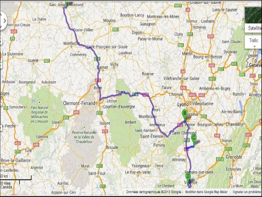 En tout début d'apreme, le gars arrive pour me charger mes 2 palettes de buches de bois compressé, et je complète avec le même style de produit au Grand Serre à 2km de là. J'ai tout loisir de réessayer les rideaux de la Schmitz puisque j'ai droit à avoir les 2 côtés, mais à l'abri, ce qui n'est pas fait pour me deplaire car sous la pluie j'aime moyen. Retour ensuite à la case Jarcieu ou je detelle la Schmitz pour en reprendre une autre mais avec des parois rigides et un Thermo King à l'avant. Il me faut attendre les palettes de Lionel qui n'arrive qu'à 17h15. Par chances mes palettes sont au cul de Lionel, enfin au cul de sa remorque et je traine pas pour partir. Pas de bol, il y a un gros bouchon d'annoncé sur St Etienne, et il drache. Moi qui voulait manger au Double D ce soir, c'est cuit. Je me rabats sur Lyon et une traversée laborieuse quand même su periph. Il y a pas grand monde sur la RCEA, je peux même faire le difficile pour choisir une place pour me faire mon repas du soir. En repartant, il y a une série de camioneurs qui me font de gros appels de phares, et je comprends un peu plus loin que je l'ai échappé belle il y avait un Polonais avec un petit 3t5 à contre sens. Petit ou pas, un face à face ça doit faire mal. Ensuite rien à signaler jusqu'à Bourges ou je me pose pour faire ma nuit, mis à part le fait que j'ai 9h06, tout va bien, demain je serai pas trop loin du café.