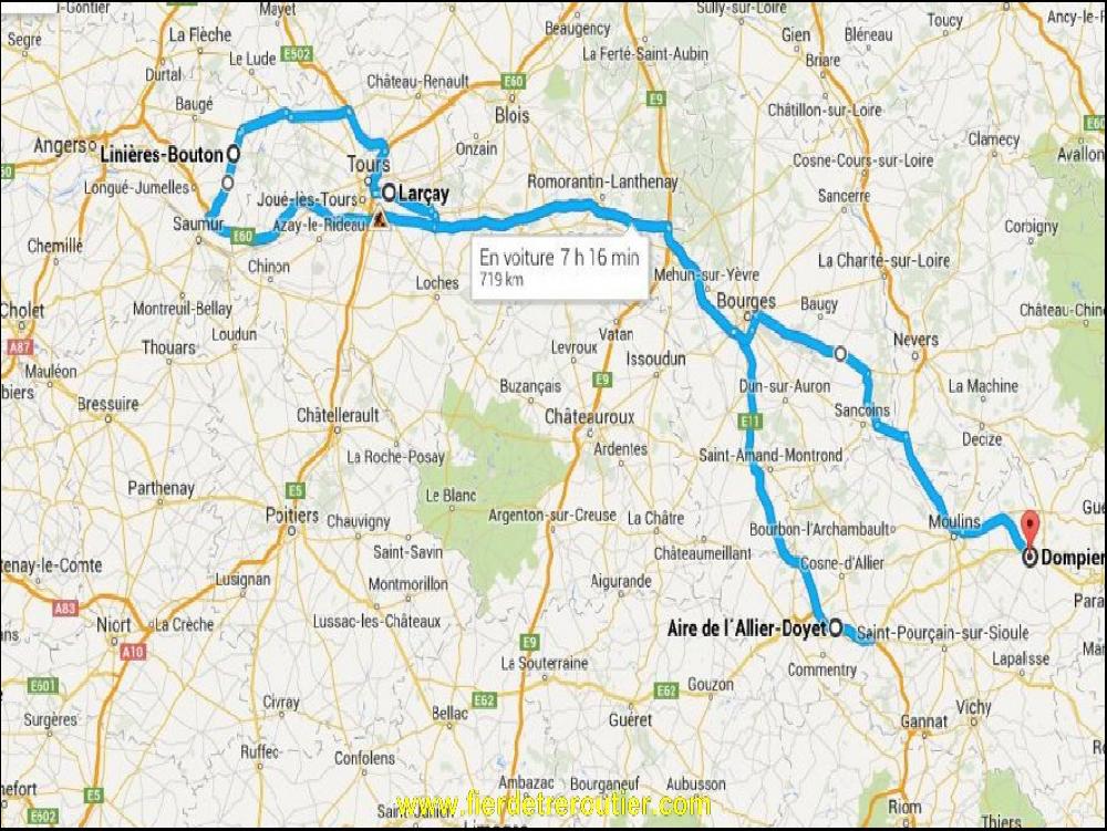 En repartant, j'ai loupé de peu Moustique57, dommage !!! Reste 3h56 à rouler, mon petit doigt me dit que ça me fait atterir en plein sur la RCEA, on vera bien, roulons à travers champs tranquille. C'est cool les apremes comme ça ou ça roule sans jamais tomber sur un casse pieds !! Je suis arrivé à Chevagnes sans m'en rendre compte ! J'ai poussé jusqu'à Dompierre en me disant naivement qu'il doit y avoir moyen de ronflir près de l'usine CITROEN, mais non, pas possible ! Les minutes tombent comme des mouches et je trouve in extremis un coin pour me garer tout prêt de a decheterrie ! Je suis trop content, je finis avec 9h59 !!! Ah ah ah, j'optimise moi msieu !