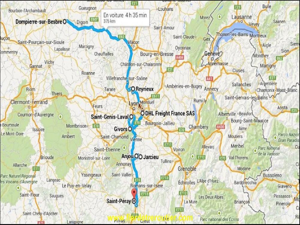 Pas de problèmes pour me lever ce matin, normal nous sommes vendredi, alors c'est la pêche !!! Je quitte discrètement mon petit parking après mon petit dej à 7h, et je rejoins la magnifique RCEA ou tous les coups sont permis. Ce matin, ça roule plutôt pas mal, un peu partout y a des camioneurs qui dorment sur le moindre refuge disponible. Comment on peut se reposer correctement comme ça ? Enfin bref, un maton classique. Comme j'ai pas le feu, je m'arrête à Belleville afin de prendre un café, et je tombe sur Randy, impec, ça fait papotter un peu. De là, je suis allé vider dans une usine de rêve ! Ben oui, on râle toujours sur les usines à la con, là, c'est une usine de rêve.... ça se trouve dans la zi de Reyrieux, on y fabrique des pièces auto en alu. Pas de protocole à la con, pas de pompes de sécu, pas de gilet, on vide à quai, et on peut dessangler pendant que le cariste vide prudement. Le must, après on a même le droit d'aller boire son café pépère... En moins de 30 minutes, c'est fait !
