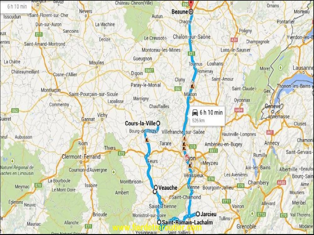 3h20 le reveil sonne, je ne me lève qu'à 3h25 nan mais oh ! C'est encore moi qui commande non ? Casse croutas à l'arrache et je demarre dans la nuit noire mais pas obscure car il y a la pleine lune. Pour changer un peu, vu que je suis pas chargé lourd j'enquille la N6. Et ça roule nickel vu qu'il y a personne sauf les derniers 50km avant Chalon ou je suis bien sagement un Lamy du 39 qui avait pas du tout l'intention de se laisser doubler... Comme j'étais pas trop enervé je suis resté derrière, bien sage. Après de toutes façons je me suis ennuyé sur l'A6 pendant que le jour se levait. A Macon j'ai été reveillé par Deutchlanden qui rentrait à la maison, c'te feignant là !!!! Comme l'A46 est fermée, je suis obligé de passer par le Tunnel de Fourvière, j'ai horreur de passer par là quand on y est obligé. Comme j'étais bien content de moi, je me suis offert une sieste d'une demi heure à Feyzin, pile poil !
