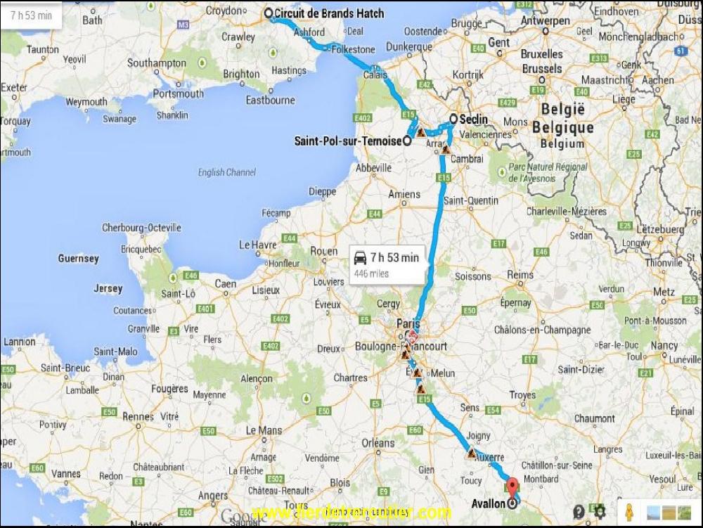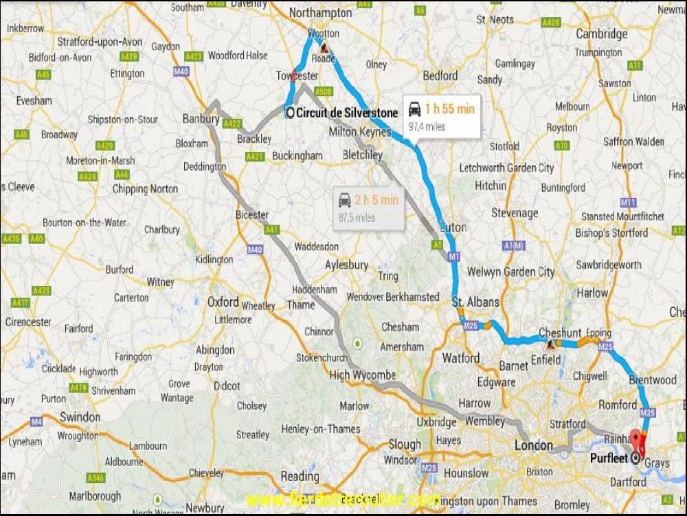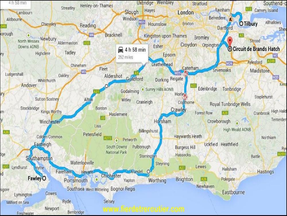Après, ça a été du billard jusque chez mon client, même le dernieres minutes perdues dans des travaux à 4km de ma destination finale à Fawley au pied de la raffinerie ne m'ont pas usé le moral plus que ça. En plus, sans le savoir je connaissais le destinataire puisqu'il est arrivé qu'on se rencontre sur les paddocks. Après avoir vidé en 5 minutes je me suis laissé offrir le café. Restait le plus compliqué pour aujourd'hui, poser le reste de mes fûts au King Arthur, on a RDV à Brands Hatch dans le KENT. Mon courage dans une main et la carte de l'autre je décide en plein accord avec moi-même de passer par Brighton ce qui me fera éviter la plus grosse partie de la M25. Car d'après BBC Radio Trafic, c'est le gros chantier, des accidents, mais aussi des problèmes à cause des français qui seraient en grève et qui perturberaient fortement le trafic des avions, ce qui se repercute innéluctablement sur la M25. Vous ne le savez sans pas, et même si ça se trouve vous vous en foutez royalement, mais un battement d'aile de papillon à Madagascar peut engendrer un bouchon de plusieurs dizaines de KM sur la M25. Bref, je ne cherche pas d'excuse pour justifier mon crochet touristique, je suis passé par la côte jusqu'à un peu avant Brighton, j'ai pas regretté, c'était joli, roulant, ça m'a reconcillié avec la GB et j'ai pas perdu de temps.... La preuve, j'ai pas mis 3h pour arriver à Brands Hatch.