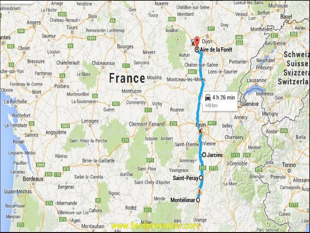 No stressage ce matin. J'attends d'avoir 11h de coupure pour decoller. J'aurai même pu en faire 12 ou 13, ça changeait rien au bacon, j'ai fait 11h01 et je me suis tiré sous un ciel plus que menaçant en me disant que c'est vachement joli le Morvan quand même. Un jour quand j'aurai fini mon regime et que je peserai plus que 90KG je viendrai ici passer des vacances parce que je suis sûr qu'on y mange bien, bien mieux qu'au KFC d'Avignon nord par exemple. Le trafic est plus que calme ce matin, et c'est tant mieux. Même calé à 81km/h je ne me fais presque pas rattraper par des collègues. A Auxerre Nord j'en ai marre et je prends la nationale jusqu'à Sens. La pluie fait son apparition juste avant Montereau, pile au moment ou je m'arrête pour manger une partie de la production de Giovanni Rana. Il touche sa bille en ravioli Giovanni, c'est pas un rigolo. Je passe la capitale de la France par l'A104 sans le moindre ralentissement ce qui m'arrange beaucoup et je fais mon stop habituel à Roye, car j'ai des habitudes de petit vieux ; déjà.