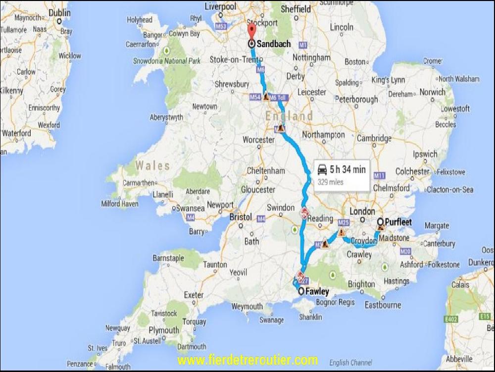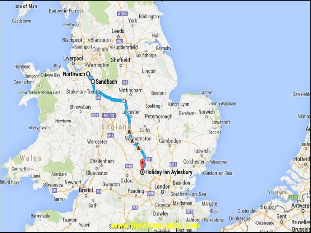 Il tombe des cordes ce matin, et oui, des fois ça arrive en Angleterre. Nous voilà donc partis avec Ludo, bras dessus, bras dessous pour prendre de petit dej, dommage y a pas de bacon ce matin... On fait un bout de routas calés sur le 7 comme les kings mais pas longtemps parce qu'on a du boulot mine de rien. Je livre pour ma part à Middlewich dans une usine à peinture, mais tabarnak, j'arrive pile au moment ou le gars qui doit me recepetionner part casser la croute ! Comme en Espagne, sauf qu'ils boivent du thé et que ça sent pas le chorizo frito... Une heure de parti quasi et je reviens vite sur mes pas direction Silverstone au ryhtme des essuie glace.