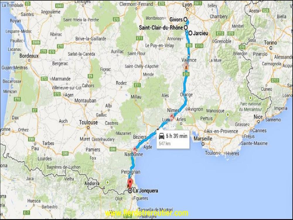 De retour au dépôt, je laisse la taut pour le frigo avec le Piaf dessus. J'aime bien, ça fait legumier. Mais voilà, je dois attendre des palettes qui trainent... C'est la faute à personne, c'est comme ça. Dans ma tête, je pense qu'à une chose passer la frontière ce soir. Je suis finalement parti à un bon 18h30, j'étais bien dans les clous pour arriver jusqu'à Gerone, en ayant même de la marge pour manger et tout et tout, mais voilà, dans ce boulot y a toujours le truc pas prévu, la merde qui te coule sur la tête. Après Valence il y a du fort trafic d'annoncé. Etant du coin c'est habituel, y a tous les écolos du 74 et du 38 qui se rejoingent ici, mais là ça bouchonne plus qu'en plein été, on se croirait sur la M25. Du coup, j'ai mis 1h pour faire Valence sud Loriol, 19km. De notre côté, il y avait rien, en face juste un accident et voilà le boulot !