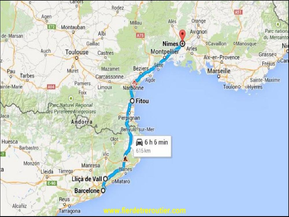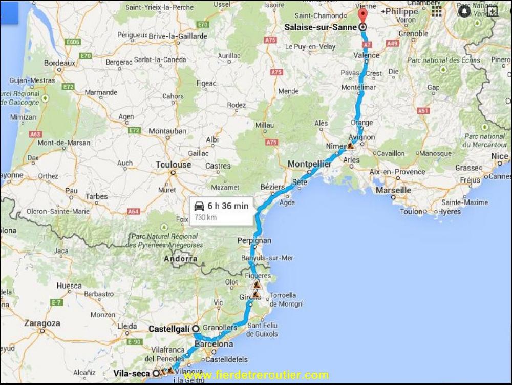 Tout comme en 2014, ici l'accueil est sympathique, les papiers sont fait direct et je charge 24 GRV ADR à quai. La commande est pas prête, ce qui m'arrange comme ça j'ai amplement le temps d'aller me caler sous la douche nickel chrome parce que la femme de menage vient juste de passer. Alors j'ai fait attention à pas trop tout lui pourrir le travail. A 10h, je suis full load et je peux aller bouffer du gasoil. Si je lambine pas trop, je peux me poser dans la zone chimique ce soir à Salaise et faire en moins de 9h de volant une coupure de 11h, une vraie cette fois-ci. Souvent d'ici je passe par Vic pour remonter, mais pas aujourd'hui ça fait trop grimper. Sur l'autoroute il y a operation coup de poing des mossos qui en ont après les bagnoles, c'est des fous furieux ces types. Comme ils sont de sortie, je fais pas le fou, je sors pas à Girona prendre mes clopes, mais à La Jonquera sur l'autoroute, je fais tirer jusqu'à Narbonne pour casser la croute.