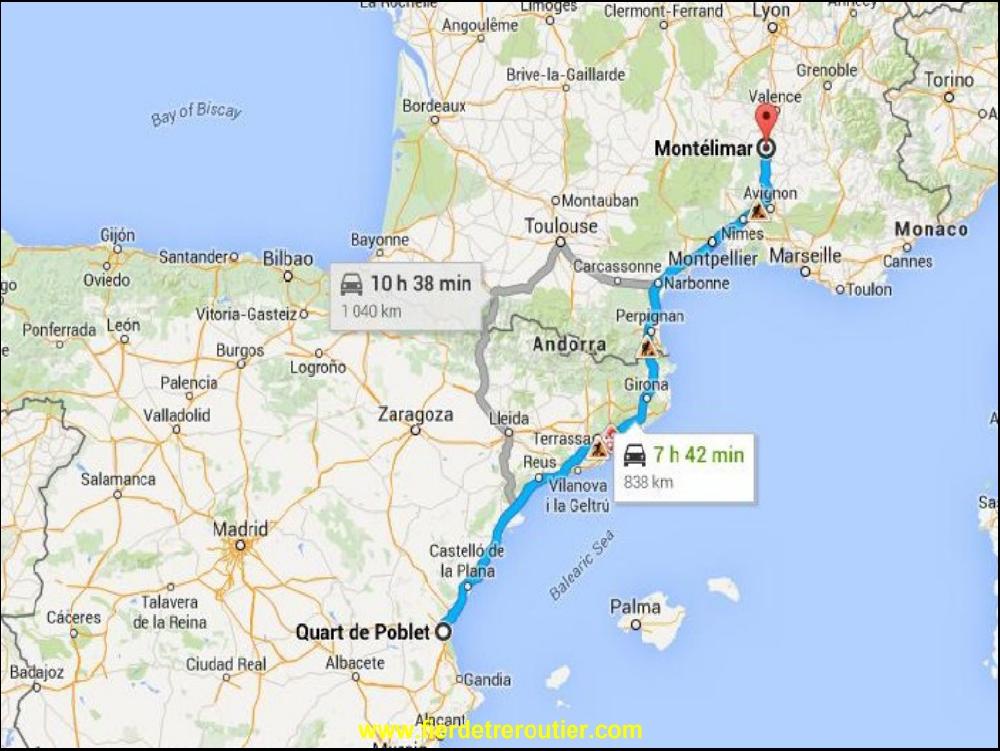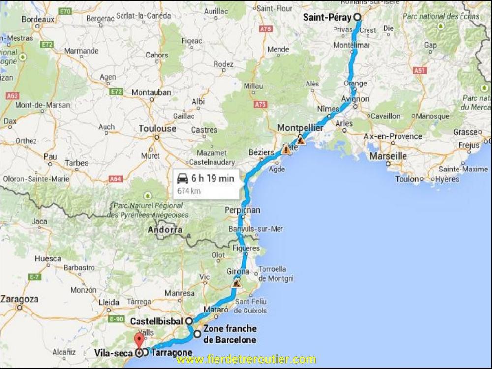 En tout je serai resté 2h30 ici, la coupure est bonne ! Je garde la 340 jusqu'à Amposta histoire de balancer un peu de gasoil, et je reprends l'autoroute au plus vite. Là ça bouge un peu moins et je peux tenir une moyenne correcte, plus je monte moins il fait beau, je stresse à mort pour passer Barcelone parce que le haut des palettes de cartons est ps filmé et qu'au moindre coup de frein tout peu partir en avant, je vais finir par claquer !!! Je fais mes 45 après Gerone Nord, j'en profite pour verifier mon voyage une ennième fois, ça a pas bougé. Il me reste plus que 4h05, je vise Montélimar, mais ça va être rik et rak.