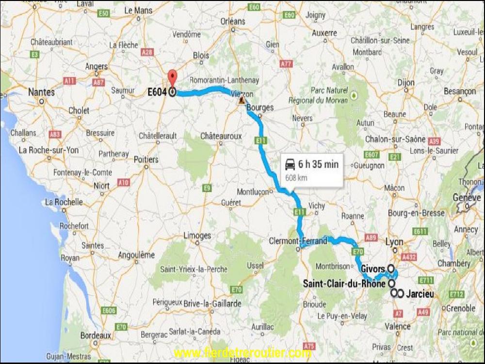 Dès la reprise de 13h30, je suis en place à St Clair, on vide et recharge en une demi heure, je peux rentrer à Jarcieu chez DUARIG Logistics. Plutôt que de redesendre en Catalogne du sud, j'ai une tournée bizarre qui me fait commencer dans le 49 pour finir en région sinistrée sur Paris. Au moment de partir, j'ai la joie d'apprendre que je dois retourner pour la 3e fois aujourd'hui à St Clair, putain, j'en peux plus. Je speede donc pour arriver avant l'heure fatidique de 16h30. La bas aussi, ils en peuvent plus de me voir aujourd'hui. Je me repaye une nouvelle fois la "Cote Rotie Road" et après une mini croisette avec mon Jeje21 je finis par me jeter sur l'A47 et surtout dans un mega bouchon avant St Etienne. Stop douche à l'aire du Haut Forez toute neuve mais ou les douches marchent déjà plus, il faut se taper une bonne marche à pieds et aller à l'Arche. C'est ça ou rester cradoque. Je marche. C'est bien propret, avec du sent bon sous les bras que je reprends le manche pour finir un peu avant midnight sur une vague aire de l'A85 bien avant Tours, disons au niveau de Montrichard pour situer.