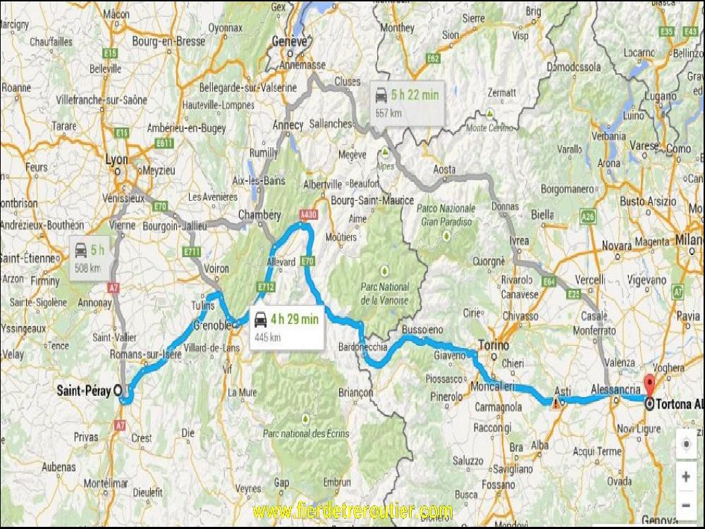 46 minutes plus tard, le bouchon a disparu et je peux continuer ma folle remontée. Bien qu'il pleuve dans mon sens la traversée de Milan s'est faite sans problèmes, mais juste juste. Ensuite c'est encore et toujours les longs travaux de l'A4 qui n'en finissent pas. Un stop douche en passant à Carisio, 30 minutes pas plus. J'avais envie de voir pour faire debrider le TX, mais es ce bien raisonnable ? La température ici a bien chuté, et je croise quelques calandre blanchies, hou la la. Il se met à doucement neiger sur Turin, et finalement pas tellement en montant le Frejus et c'est tant mieux. J'arrive à la plate forme sans patiner, ouf. Je fais ma dernière demi heure de coupure en attandant l'escorte, et par le plus grand des hasards je suis rejoint par Alain, qui passe lui aussi sous esorte, du coup on est deux Duarig entourés par les gyrophares, on est bien vus !!! On se jette un café vite fait à la Total après Modane, Alain va sur Grenoble parce que c'est sa ville préférée après Paris, et moi je profite qu'il fait nuit pour continuer à speeder, juste parce que ce soir j'ai la patate et que rien peut me faire changer d'idée. Je savais par trop par ou rejoindre Serrières dans le 01, le GPS voulait me faire passer par des routes incroyables du genre à traverser les Avenières, moi j'ai choisi l'option Morestel. J'ai quand même dû me farcir Aoste By Night, à la régule, LOL. A force de speeder, je suis passé le long de la centrale de Malville pour atterir dans la cour de l'usine au calme à Serrières en 9h57, ptin, j'ai le cul bordé de nouilles Barilla.