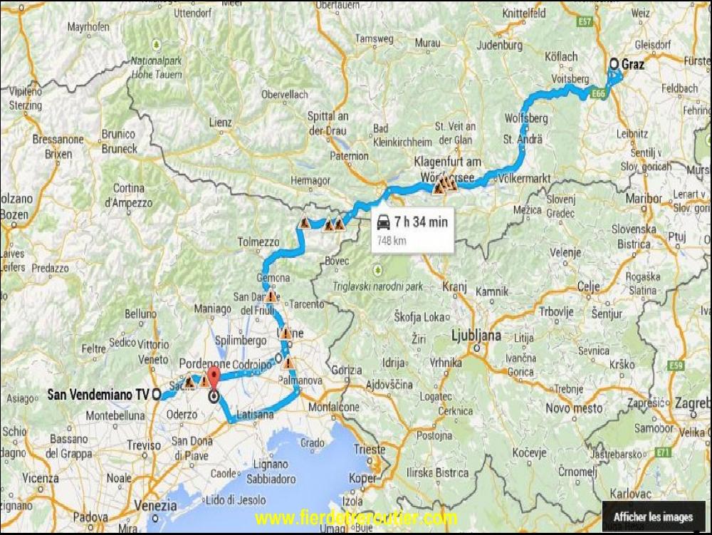 Une heure plus tard, c'est bouclé, j'ai vidé mes 4 palettes et j'en ai repris 2 en retour, ici, c'est secret defense, je dois rien savoir, sauf qu'il faudra tôt ou tard revenir, je peux repartir toujours avec mes belles plaques orange. Entre temps le trafic s'est bien chargé et c'est bien la misère pour sortir de Graz, je suis juste halluciné par le nombre de Clubs qu'il y a par ici, sans compter un immense Eros Center, ça doit bien rigoler dans les chaumières le soir en Autriche. Je recharge presque à mon point de départ de ce matin, du côté de Pordenone, pour faire le trajet je me suis calé derrière un Autrichien qui double la ou c'est interdit mais qui freine la ou il y a potentielement du contrôle de vitesse, moi ça me va, ça me facilite la vie ! Avec la nuit, le froid arrive vite et dans la foulée les saleuses sont de sortie, si en France ça pouvait se passer pareil... Mais non. Je finis par arriver à 22h30 devant mon client de demain à Azzano Decimo avec 9h49 de routas, bien bossé !