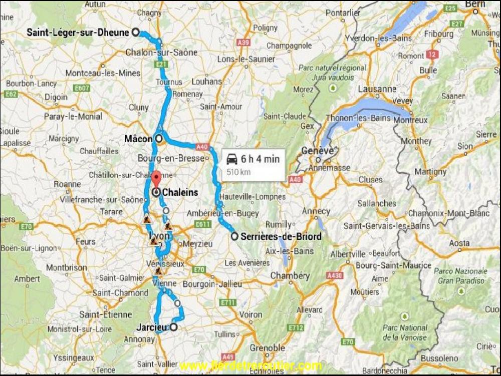 Une fois vide, j'ai déjà du travail, direction Macon. Comme c'est le pays d'une star de chez DUARIG, j'appele Ray pour avoir quelques infos, mais il connait pas le client, il sert vraiment à rien ce mec, il est juste bon à faire la couv des programmes télé. Heureusement, Sweden, lui il connait le client, il est pas là à s'arranger le brushing, lui il bosse. Et il m'a même mis au parfum, fais gaffe, c'est la merde pour rentrer à quai, effectivement, il y a un sale devers et ça passe juste juste sous le porche, mais ça passe puisque pour une fois j'ai rien brisé. Les gars sont bien sympa, ils ont fini de me charger alors que midi était largement passé. De là, je vais dans l'inconnu absolu entre Chalon et Autun à St Leger sur Dheune. Avec un nom pareil on aurait envie de situer ce genre de bled dans le 59 ou le 62, mais non, c'est bien dans le 71. Le coin est magnifique, calme, et visiblement on y fait du vin qui soit disant est pas degueu. Je charge chez un transporteur, un passionné de transport, et c'est de moins en moins le cas, comme on dit : le patron fait le chauffeur... Vrai ou pas ???