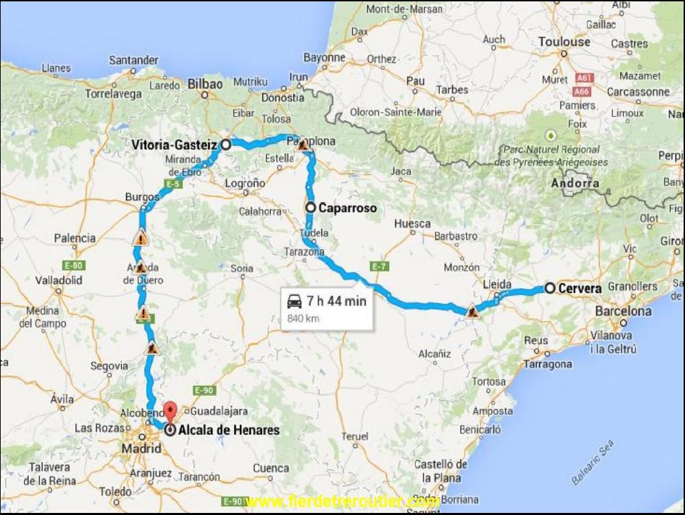 C'est le moment de faire le point avec les heure de conduite. Je sais c'est pas interessant, mais je suis obligé. Mon client suivant est à Alcala de Henares, juste à côté de l'aéroport de Madrid. D'ici, il y a 363km, il me reste 4h19 à conduire pour faire 10h. Le GPS annonce 4h20. J'adore. Etant de nature joueuse, j'ai envie de tenter le coup d'autant que j'aurai que 400kg dans la remorque, c'est jouable à condition de pas trainer bien entendu. Je me concentre et je sors de l'usine à MachIII. Il faut traverser un bout de la Ronda, mais vu l'heure ça passe bien, les avenues sont larges comme à Mouscou, d'ailleurs ça ressemble un peu à Berlin EST. Comme j'ai les crocs, je stoppe avant Burgos sur un parking ou il y a rien et bien le long de l'autoroute histoire de pas perdre une seule minute. C'est con, mais on nous fait devenir con. Après Burgos commence une longue série de cols plus ou moins hauts, et par ici, il a dû neiger un sacré paquet, c'est joli. Je passe le plus clair de mon temps à zieuter l'heure sur le GPS, je grapille seconde par seconde. Le 500 lache jamais le 90, et c'est tant mieux. C'est l'hiver arrivé au point culminant à Somosierra à 1444m d'altidude. 2km de tunnel, et de l'autre côté, le contraste est saisissant, il y a un franc soleil. Plus je descends plus la température monte ainsi que ma pression interieure ! L'avantage en venant de l'A1 c'est qu'arrivé sur Madrid on chope direct la M50, 8 voies, deserte. Si on compare à la M25 Londonnienne, c'est l'enfer, ici le paradis. J'ai bien fait de tenter le coup, je suis arrivé en 4h16 au gardien à Alcala. Pfuuuu. Malgré tout je vais passer 1h pour deux pauvres palettes, il y a un papy à la reception, qui se comporte avec l'ordinateur un peu comme une poule avec un couteau. De là, j'ai plus qu'à sortir me garer le long dans la zone, bien content ! Et comme on dit, si t'es content mieux !