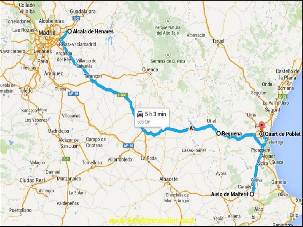 J'ai donc tout loisir de tenter de battre mon record au Tetris, tous carreaux ouverts, il fait vraiment bon aujourd'hui. Comme prévu à 15h, le portail s'ouvre, il faut reculer vers un improbable quai en montée, il y a devers pas possible et j'y vois que dalle dans le hangar. Alors je vais arracher quoi sur cette semi neuve finalement ??? Finalement rien du tout, le gars qui guide à l'habitude de faire rentrer des camions la dedans, toujours est il que le hayon a eu la trouille de sa vie. En 10 minutes les 5 palettes de seaux vides sont chargées. Entre temps, j'ai eu droit à la question qui tue, à savoir si je peux mettre 4 longueurs de 6mX0.30 par dessus les palettes pour un poids de 240kg, bien sûr je reponds oui, que je vais tenter, sachant qu'il me reste 40cm par dessus les palettes... Je reçois la commande juste avant Valencia, l'adresse est moisie ça commence bien, merci Google, la bonne adresse est à Quart de Poblet, juste à côté, j'y arrive à 16h, il y a deux quais et les deux sont pris.