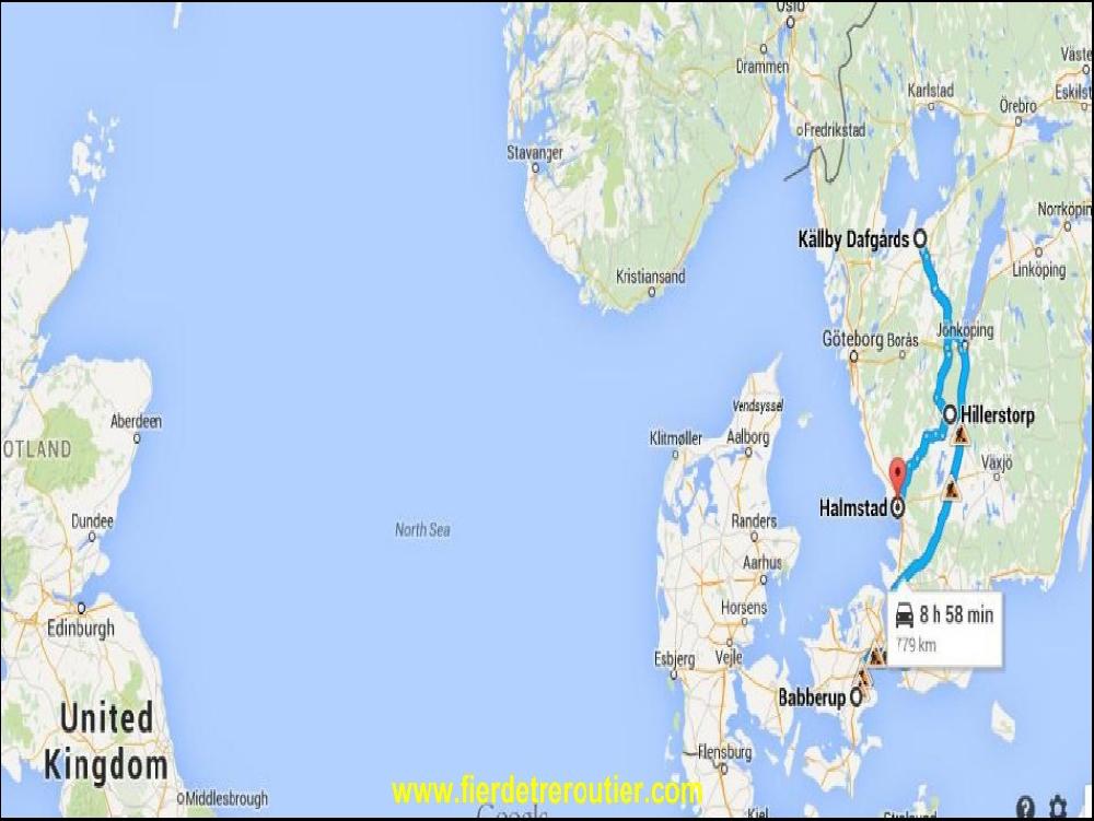 43 minutes plus tard, j'étais debarrassé de mon full load de pains au chocolat et autre specialités de chez nous. J'ai un rechargement pour le 76 à un peu moins de 200km d'ici au sud. Par contre après, il me faudra descendre au dépôt pour tout revider et rechargé. C'est niqué pour la coupure de 11h et je crame une 10h. Le temps change du tout au tout ici en une poignée de minute, mais aussitôt qu'il fait soleil, les hommes tondent la pelouse, et les femmes aussi. Car le printemps arrive !!! Au bout de 2 grosses heures je finis par arriver à Hillerstorp pour charger des palettes bien merdiques de 2m45 de large et de 40cm de long (mais si les cadres qui tombent vite fait). Ici, y a juste un mec qui vient te montrer ce qui y a prendre, tu signes le CMR et demerde toi. J'ai pas transpiré autant que les deux tracos SK et CZ de Bring à côté de moi, mais c'était pas simple ! 11m50 d'annoncé, au final y a 12m50. Aucune importance, je rentre au Swedish Hub Transport à Hallmastad, ça roule nikel, à 18h15 je suis en coupure et à quai en train de raconter des conneries sur le forum !