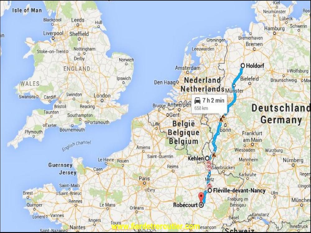Vu l'heure maintenant la Lorraine c'est du velour, je prends les clopes en passant à la Aral et une poignée de secondes plus tard je passe l'antique panneau FRANCE completement destroy, ça donne le ton de l'état du pays ; ça roule nickel sur l'A31, parfait, mais arrivé à Fleville j'apprends qu'on me chargera qu'à 14h, ok, j'ai pas le choix donc. Du coup, je reste 3 bonnes heures à me dorer au soleil au quai 12, 14h50 je repars direction le sud, encore une bonne heure de route à travers la Lorraine via le magnifique village de "Thuilley aux groseilles" jumellée avec la Perigourdine "Téhencore aux fraises", route plein sud donc pour echouer au milieu de nul part, mais au milieu de d'une bonne odeur, ni de groseilles, ni de fraises mais de bouses de vaches à Robecourt, tranquille Emile !