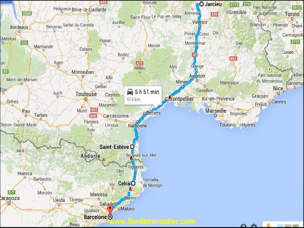 Je demarre à 3h, en même temps qu'Alain, autant je suis explosé, autant il a la forme. Moi ce matin, ça va pas du tout, je sais pas si c'est le contre coup de la grippe, mais j'ai sommeil et pas qu'un peu, en plus il y a du brouillard pour rien arranger. Tant et si bien que je suis obligé de m'arrêter dormir un quart d'heure sur le volant à Tavel, j'ai même dûr renouveller l'opération à Fabrègues pendant que le jour se levait, c'était ça ou finir eparpillé au milieu de l'A9. Etant donné que j'ai pas fini de payer mon crédit et de ramasser les feuilles mortes au jardin, je préfère assurer le coup en dormant un peu. Quand je repars de Fabrègues le jour s'est enfin levé, je tire jusqu'à Narbonne, ou je sors avec déjà 4h15 de guidon, une bonne douchas café croissant me feront le plus grand bien !