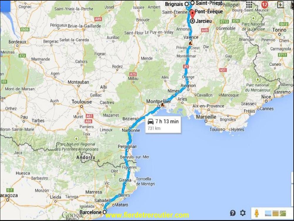 6h du matin, j'ai super bien dormi, et il fait un peu frisquet ce matin pendant que je balance le gasoil dans le reservoir. La journée s'annone belle et sêche. D'ailleurs heureusement parce que j'ai 4M de vide à l'avant et 15T à l'arrière, ça patine pour un rien. Je roule un peu comme on marche sur des oeufs, bien que, à titre personnel je n'ai jamais tenté l'experience pour de vrai. Je debarque juste un peu après 7h à La Roche, il y a déjà un camion avant moi. Sauf que c'est pas prêt pour lui et qu'en plus, je suis PRIO-RI-TAIRE ! Et oui !!! En principe ce que je charge devait partir hier, alors ça traine pas. Finalement ça tient sur 3M, je respire un peu mieux avec un peu de poids sur la selette. Je passe du coup juste avant le coup de feu pour rentrer sur Valence NORD, impeccable. Ce matin, il fait vraiment un temps magnifique et quand en plus on a bien dormi, c'est que du bonheur ! Je debarque à Narbonne avec 4h20 de routas, je suis pile poil dans les temps.
