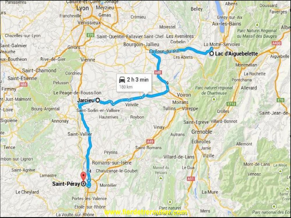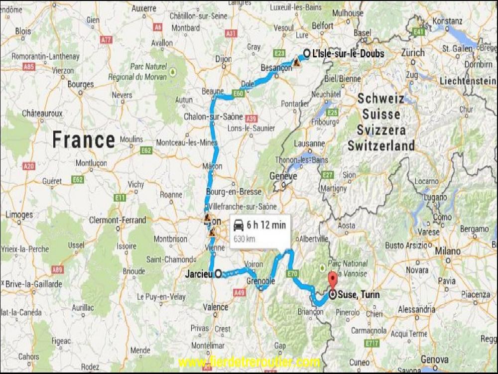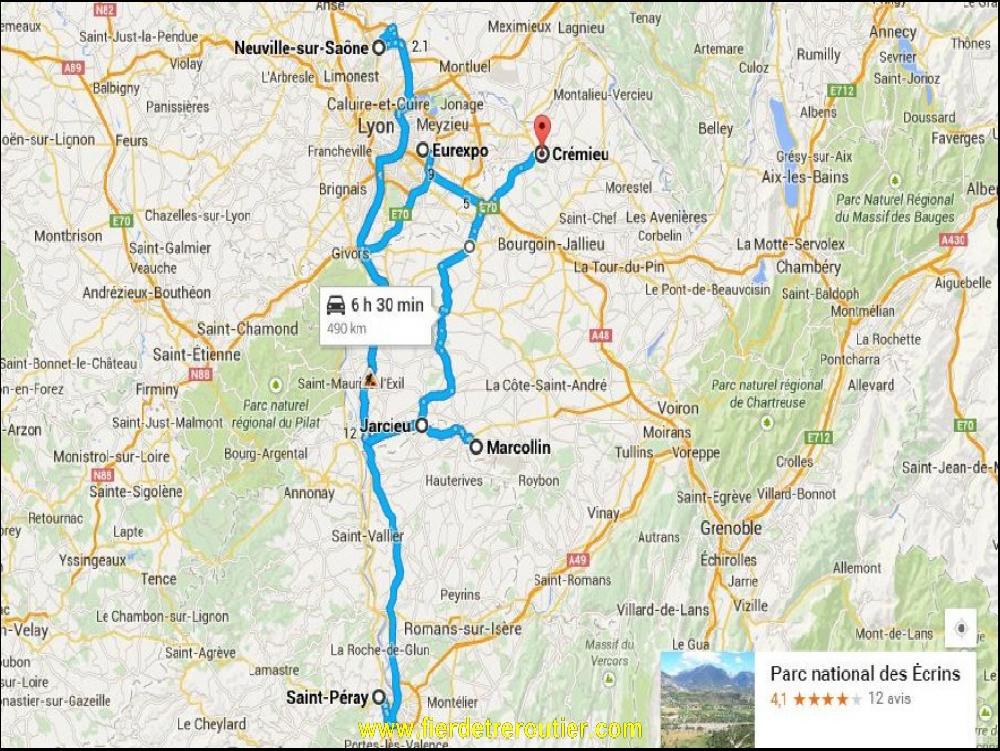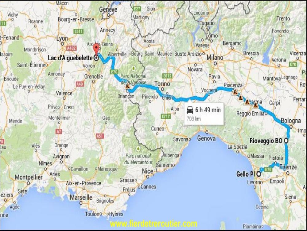 Alors ma decision est prise, je tente l'itinéraire BIS, d'ici ça rallonge de 20km pour aller à Jarcieu, mais au moins ça roule nickel par Chambery. Je coupe par Les Abrets et le lac de Paladru, en plus c'est joli et la pluie me lahe un peu les baskets le long du lac ça fait du bien !! Régis m'attend comme le Messie (enfin c'est mes palettes qu'il attend). Finalement j'ai mis 2h en passant par là, je pense pas avoir perdu de temps. Je garde mon lot de Manheim à l'avant et je pose à regret du Marina di Latina, c'est le jeu ma pauv Lucette !! Greg me donne du 67 et j'ai un complement pour le 25 en passant. Du coup mon amplitude est poussée au bout, je reste ici, demain départ 6h ça ira bien.