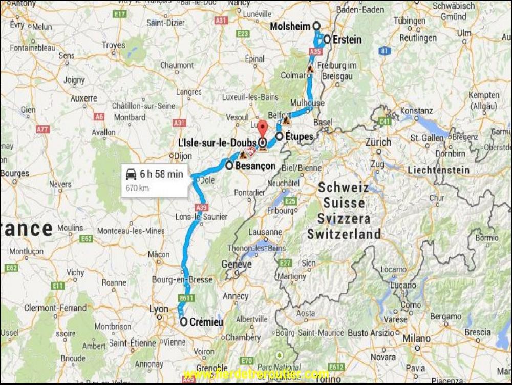 Il fait franc soleil en repartant à 8h d'ici, bien content d'avoir pas trainé en fait, dans l'autre sens les accés vers Besançon sont bouchés, mais moi je m'en fous, je suis dans l'autre sens Ha ha ha ! Je reprends donc rapidos la magnifique A36 pour rejoindre la bonne ville d'Etupes pour y poser 3 palettes de Mediapost. Il y a un camion à quai, mais le chauffeur s'est barré à la boulangerie café à 100M de là. Avant moi, il y a un livreur en 4 roues, j'ai cru qu'il allait faire un infarctus à l'idée de devoir attendre 47 secondes. Heureusement ça traine pas non plus ici, et je peux foncer au dernier à Molsheim. Le GPS indique 11h07, ça ferme à 11h30, je tente, il faut toujours tenter dans la vie, sinon on a rien. En heures creuses Mulhouse ça passe nickel, je vais juste perdre du temps derrière un convoi exceptionnel après Colmar. Derrière moi, il y a la Zouille25 de chez Beteille, mais elle non plus à pas le temps, on boira un coup à la retraite. Finalement je debarque à 11h15 à Mediapost Molsheim, le cariste m'a dit " sans jeu de mots, c'était à un cheveu" Oui, j'ai les cheveux un peu longs, mais j'ai les idées courtes, j'ai pas su quoi répondre. Le lundi et le mardi, y a pas de reception l'après-midi, OUF, j'ai fait le job, pile poil.