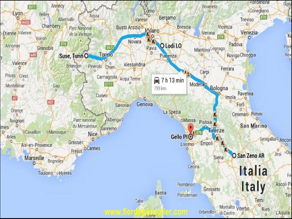 1h pour bouffer, tranquille, et je repars sans stress, de toutes façons maintenant ça fait que descendre. Franc soleil arrivé sur Firenze et même 22° ! ça biche !!! J'essaie de pas me paumer pour rejoindre San Zeno en sortant à Arezzo, bien sûr la route qui m'arrangeait est interdite aux 7t5, je suis quitte pour faire 5km de detour, je déboule finalement à 14h30 comme prévu. Je suis vite mis en place, je defais les côtés et je laisse faire les gars, je regarde travailler, à l'ombre, il y a de la bonne humeur, on se croirait quasi au printemps. Une fois vide, j'ai la joie d'avoir mon retour à Gello, à 20km au sud de Pise. J'ai la baraka parce que j'ai les heures pour y aller donc, je traine pas. 2h30 de route face au soleil, c'est usant à force c'est mieux l'hiver, y rien à faire. Quand je debarque à Gello le chef s'en va, domani à la 8h15 ! Impec demain grasse mat !