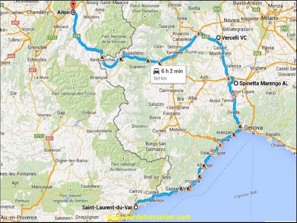 Comme il faut arriver avant 17h, je me suis pointé à 16h50 sur la plate forme logistique multi modale de Vercelli, tranquille ! Ici ils ont l'habitude de nous voir alors une fois à quai ça va vite, sauf peut être pour les papiers. Je charge du solvant de la peinture, bref, tout un bordel que je devrais declarer au tunnel bien sûr. Je passe Turin juste après l'heure de pointe, il y a encore du monde mais ça bouchonne pas, par contre ça deboite et freine dans tous les sens, si on ajoute la pluie à tout ça, c'est pas extra. J'attends presque 40 minutes pour l'escorte ADR, et le pire c'est qu'on a traversé le tube à 50 pas plus, je devenais dingo ! Pour ne rien n'arranger le tunnel d'Orelle est fermé, il faut encore perdre un peu de temps par la N6. C'est finalement à Aiton que je finis par échouer, ce soir je dois faire une 11h, fallait pas trainer plus !