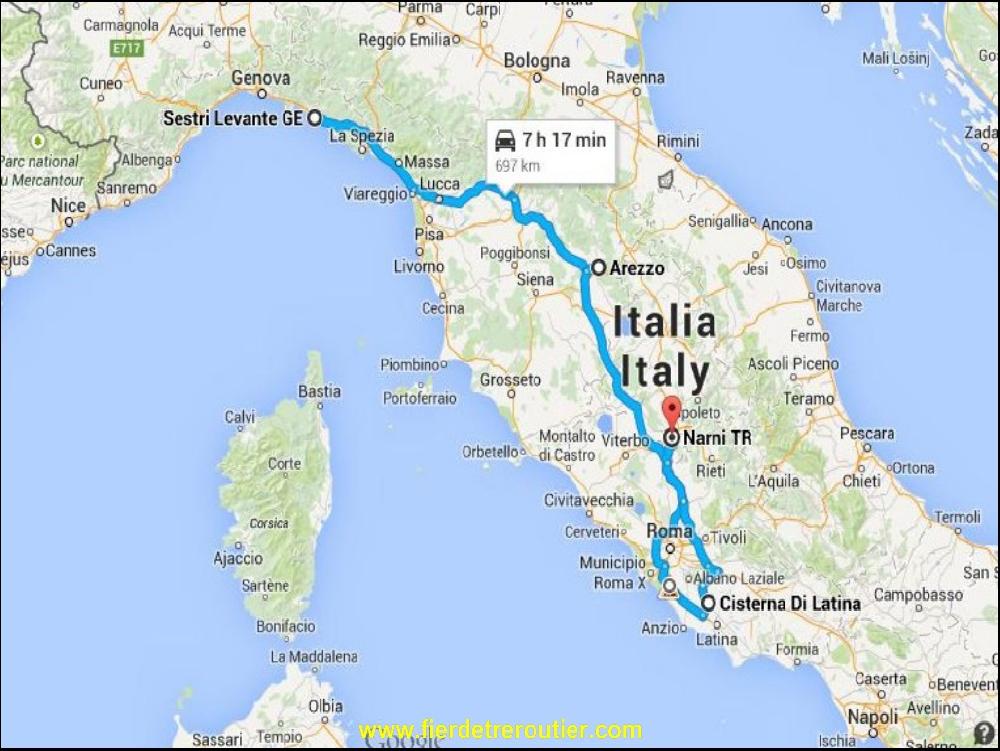 Quand je repars j'ai 3h01 de coupure en place ici, c'est drôlement bien !!! Sauf que le client suivant à Cisterna Di Latina, receptionne jusqu'à 15h. Le GPS lui me prédit une arrivée à 15h55. Bon, autant ne pas s'affoler, enfin, si je dois quand même m'affoler, tenter le coup. Mais, fort de mes 25 ans d'experience de route, j'ai pas envie de tenter le coup et debarquer contre un portail fermé sans avoir pris ma douche. Justement, j'en connais une pas mal sur l'A1 à 1h d'ici, alors vaï !! Ce midi en plus ça roule plutôt zenement sur l'A1 comparé à hier apreme. Un petit quart d'heure sous la douche, histoire de pas trainer et d'aller à l'essentiel. Moi qui esperait un soleil magnifique et un bleu du ciel limpide, c'est raté encore aujourd'hui, il fait limite moche. Pour rejoindre Cisterna, j'hésite, soit je passe par la montagne mais ça me dit rien qui vaille, soit je passe par Rome et Pomezia. Va pour la seconde idée, vu l'heure le GRA, le periph romain va bien bien passer. Au péage à Rome, il y a un gros contrôle PL, un flic a voulu m'arrêter, mais il s'y est prit trop tard, il a sifflé alors que j'étais bien trop loin et bien trop élancé, j'ai bien vu dans son regard, le "et merde..." et non mon coco, ciao !! Comem prévu je debarque à Cisterna à 15h55. Le gardien appele la reception, en retour on entend un mec hurler "domani à la 7". Le gardien m'a dit, ici, c'est 15h maxi. Ok no problemo, je vais au camion j'ai les crocs.