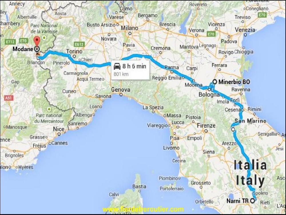 La marchandise n'est pas tout à fait prête, ça me laisse le temps de manger un bout. Ensuite, c'est super rapide, les types se mettent à quatre pour charger un complet de peinture, au quai à côté, il y a un Letton qui charge pour la Russie, j'ai l'air malin moi avec mon petit Meyzieu. Mais je pense quand même avoir du bol parce que ce week-end, je pourrais tondre et aussi acessoirement profiter de ma famille sweet famille... Fort de mes 19T je decolle à 16h pour me jeter sur l'A1, pleine comme un oeuf mais ça roule, je fais tirer jusqu'à Vilanova d'Asti pour passer à la Karsher, 30min de parking gardé, la douche et le café pour.............. 1€ !!! Putain, je kiffe la life ! Je passe Torino à la régule, et je moisis une demi heure pour passer le tunnel, normal, c'est le tarif en ADR ! J'ai juste de quoi sortir à l'autoport à Modane, ou il reste juste une bonne place pour un gros feneant comme moi, pile poil !