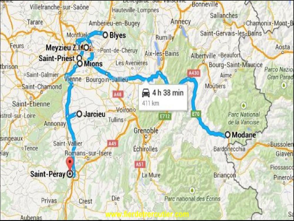 Pas de mission intergalactique ce lundi, faut juste vider à Grigny. Enfin, je sais pas si je dois monter ou deteller en route. Alors pour pas faire de conneries, je vise 8h à Grigny en calculant que le chef envoie le message du matin à 7h15 ça fera que j'aurai pas depassé chanas. Alors je suis parti à 6h38 de la maison, c'est classe comme chiffre. Comme prévu le message arrive à 7h20, et j'ai la onfirmation d'aller vider à Grigny chez KP1. L'usine est si grosse qu'elle est même dans le GPS. Pour vider les polystirène ici, ça va super bien, il y a un enorme Fen qui prends les paquets 2 par 2, en 10 minutes c'est vide, il faut juste courrir pour tirer le rideau de la semi. Ma première ramasse ne tarde pas, une enorme palette de 6mx2m à Chassieu pour Blackburn. L'avantage c'est que nous sommes en periode de congès scolaires, je prends l'A7 à la régule à Vernaison. A chassieu je suis bon pour ouvrir le toit pour charger, mais c'est une formalité avec la semi neuve. De là, je vais carrement à l'opposé, sur l'Ouest Lyonnais dans la magnifique vallée d'Azergues. J'ai deux palettes de tissus pour faire des voiles à Chassy, ça va aussi en GB, mais à Southampton. Je commence à croire que je vais aller en Angleterre. Jusqu'au moment ou je reçois la 3e ramasse, à Brindas pour vider à Chanas...