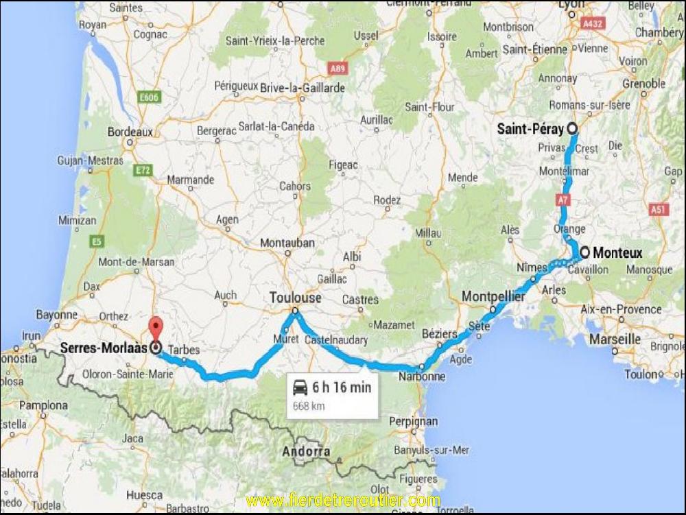 Je me gratte la tête avant de repartir de Monteux. La traversée d'Avignon est au rouge vif, un coup à paumer une heure. Et j'ai tout, sauf envie de me prendre la courge à Avignon. Du coup, je prends les chemins de traverse comme Francis Cabrel pour rejoindre Sarrians et Orange puis l'A9, ça rallonge un peu, mais je pense pas avoir perdu de temps. Comme j'avais pas passé l'A9 depuis quelques semaines, j'ai pu voir que les travaux avaient pas mal avancé, il y aura une belle sortie pour Vendargues, ça sera pas du luxe. Déjà 4h30 de volant depuis ce matin arrivé à la station à Beziers Montblanc. Je me gare au plus loin que je peux de la station, c'est fermé la nuit, je vois pas pourquoi j'irai la journée. Comme il est un peu tout pour becter, je roule jusqu'à Bram avant de mettre ma serviette autour du cou. Je me paye même le luxe d'une sieste digestive !