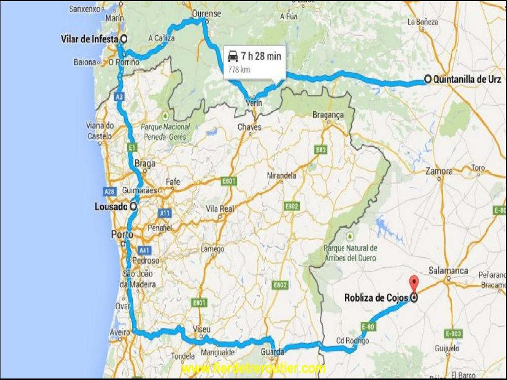 Un chauffeur Portugais habitué à faire le même voyage que moi, me conseille de passer par Guarda, ça grimpe moins que par Chaves. Bon, après validation par Gentil Organisateur 38, je mets le cap sur Porto sous des trombes d'eau, il y a quelques accidents à cause de l'aquaplaning, impressionant tout ça. Du coup j'ai rien vu de Porto mis à part l'immense stade de foot. La plus dur c'est de grimper sur Viseu, ça tire pas mal, j'ose pas imaginer par l'IP4 que j'ai un moment hésité à prendre en souvenir des anciens qui n'avaient pas la RSE !!!! J'ai voulu faire le fou et faire une photo le long du batiment de la douane à Vilar Formoso, mais il pleuvait trop et les douaniers me regardaient bizarre. Il faut dire qu'il y a un gros panneau interdit aux 5t5 juste avant. Mais chuis pas d'ici moi les mecs !! Je trace donc juste avant Salamanca à Robliza de Cojos, ce soir j'ai envie de viande salée et de frites, vu la pluie qu'il fait dehors on se croirait en Walonie !