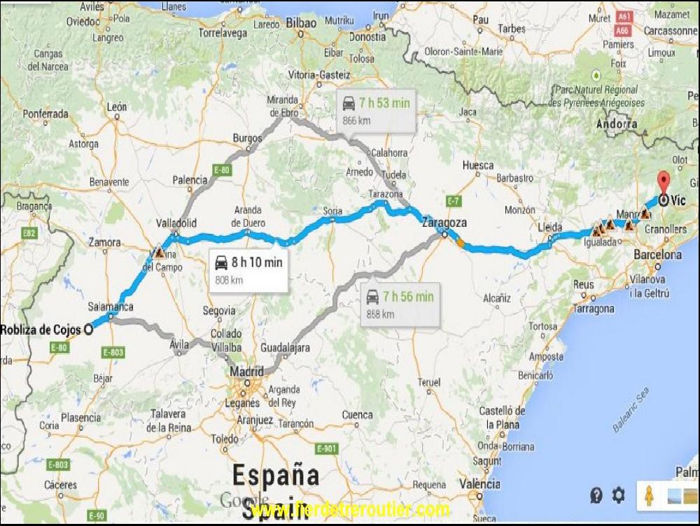 C'est à 5h15 ce matin que je move my body jusqu'au siège extrement confortable de mon côté conducteur. Il ne pleut plus, ouf. Ma joie sera de courte durée, à peine arrivé à Salamanca, il repleut, et ça m'a manqua pas ! Le bulletin météo me confirme qu'une trés violente perturbation va passer exatement sur mon chemin, Navarra, Aragon, Catalogne ! Oh dis, hé c'est pas fini oui ?? Depuis Porto tu me suis, y en a marre là ! Va un peu en Bretagne la pluie là !! Allez pchuiit file ! Rien à faire, elle reste collée à moi. Malgré tout ça, je passe la bonne ville de Valladolid juste avant que le gros des troupes de chez Renault n'aille bosser et je me retrouve seul ou presque sur la route de Soria ou le jour commence à montrer son museau. J'ai déjà 2h30 de route quand je m'arrête prendre mon petit café solo accompagné d'un Donut bourré de produits chimiques.