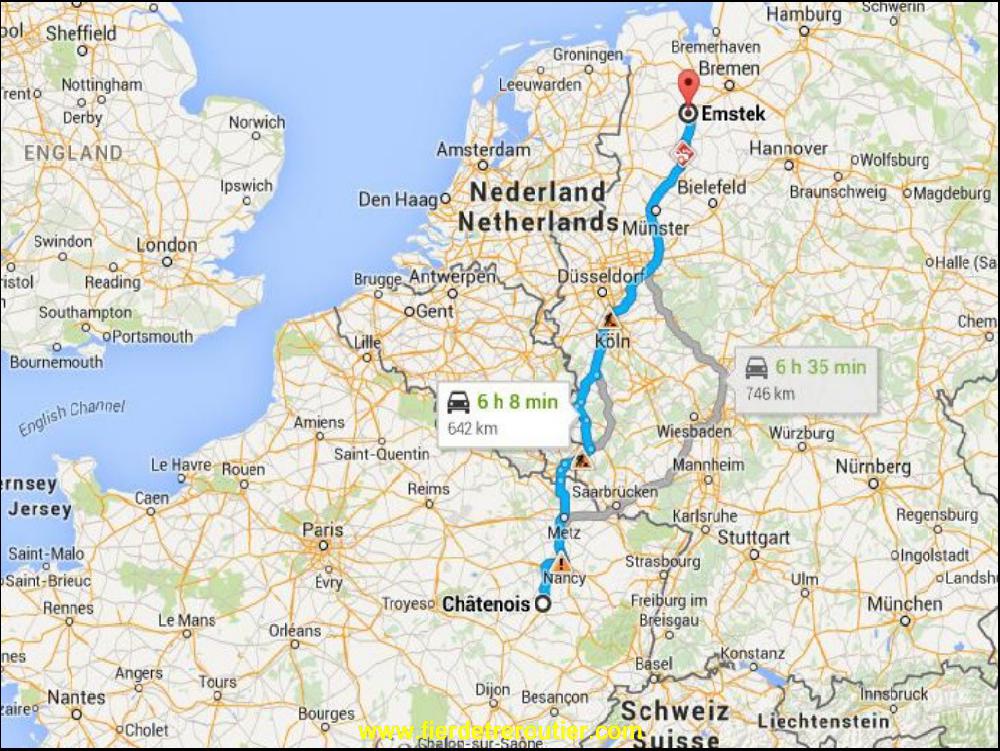 Grasse matinée ce matin, reveil à 8h15. Ah ça fait du bien ! Coup d'oeil au gasoil, on m'en a pas chouravé, impec. Avant de partir pendant que je mange ma barre de céréales Grand Mère, enfin GRANY, je fais le point, tel le capitaine de sardinier entre L'Ile du Frioul et le Chateau d'If. Déjà 82h à la quatorzaine, jusqu'ou monter aujourd'hui ? Je mets des points de chute au hasard dans Google Map, et je me laisse tenter par Cloppenburg. On vera bien. Sans OBU c'est pas simple l'Allemagne. Comme prévu par Albert Simon, le temps a resolument changé dans la nuit, il fait moche, je traverse le nord des Vosges puis la Lorraine dans la mochitude absolue. Je remplis le gasoil à ras bord à la total à Metz et je prends la taxe Benelux à la Maxe, ou il y a déjà pas bien de place en temps normal, mais vu les travaux c'est pire. Y a un Hollandais bien sympa au comptoir, on charie un peu la serveuse qui lasse de voir nos gueules de cons, finit par nous payer sa tournée de café !