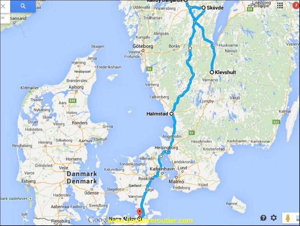Ce que je craignais est arrivé, je recharge complet pour le Luxembourg, dans la semi, j'ai 21T mais pas un seul kilo pour le Rhône Alpes ou le sud. Bon, déjà, y a de quoi charger c'est pas mal. Tout est dispo, je suis resté 36 minutes à quai, en garçon prevoyant j'ai attendu que ça fasse 45 min et j'ai mis cap sur le sud. Comme j'avais rempli d'avance ma reservation à la Scandline Helsinborg j'ai pas attendu les tickets et j'ai attrapé le 19:15 au vol, enfin, à la bouée quoi ! Mais j'ai pas les heures pour arriver à Rodby, donc, je vais me poser avec 9h47 de routas à Norre Alslev sur un parking de centre routier ou il y a rien mis à part des pompes à gasoil et un garage volvo. Allez courage, il faut dormir !