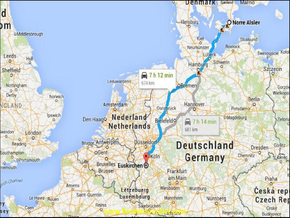 Après un savant calcul, il me reste donc 4h10 à rouler aujourd'hui. Je devrais largement passer Cologne. Après Emstek, il y a presque plus de zones ou on peut doubler, et je reste coincé dans une interminable colone de camion, 70,75,80... pfff super dangeureux, il faut être attentif, c'est pénible. Enfin, je prends mon mal en patience, de toutes façons, si je me fie à Google Map, c'est franc le bordel à cologne. Je fais une pause gasoil vers Wuppertal et je me rejette à l'eau et les bouchons de Cologne, ça passe doucement mais a roule. C'est finalement juste après Euskirchen que je me pose avec 8h53 de guidon, y a assez, j'en ai ma claque aujourd'hui.